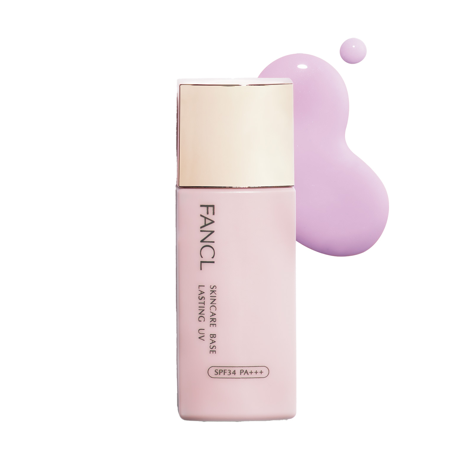 各種肌ケア成分が滑らかに肌を整え、ファンデの密着度をUP。テカリ・カサつきを防ぎ美しい仕上がりが叶う。スキンケアベース ラスティングUV パープル SPF34・PA+++ 25ml ¥2,200(ファンケル)