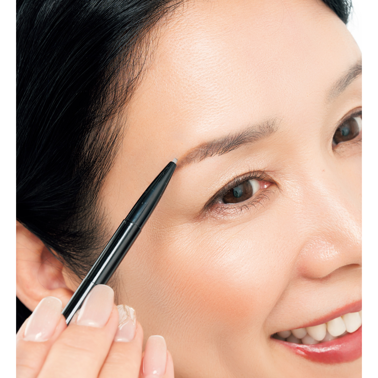 全体的に直線的なイメージで描きますが、眉尻は少しアーチのある、上向きなラインを意識。そう描くことで、ぐんとアップした印象になるんです。
