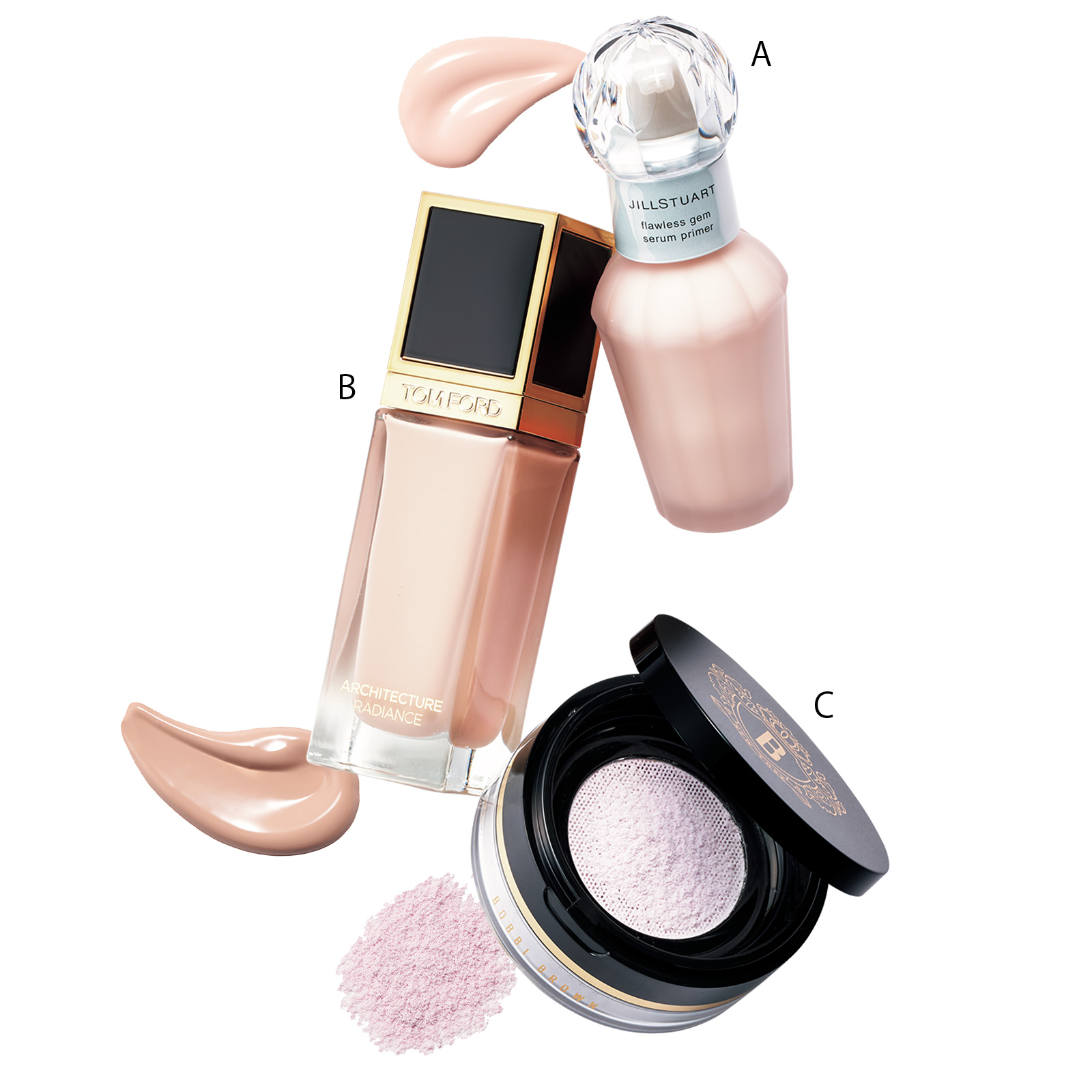 【A:明るめベージュの下地で血色感あげ】光を味方にツヤ感をプラス。ジルスチュアート フローレスジェム セラムプライマー SPF20・PA++ 30ml ¥3,850(ジルスチュアート ビューティ)▶詳細はこちら(公式サイト)