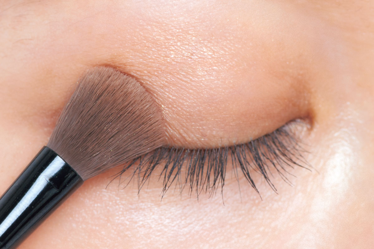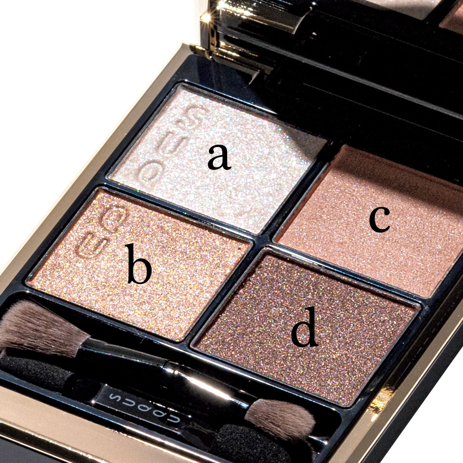 b.と c.をブラシに取って混ぜ、上まぶたのキワから左右にスワイプさせながらアイホールまでシャドウを広げ目の縦幅を拡大。目尻から真横にひとはけし、横幅も拡大します。