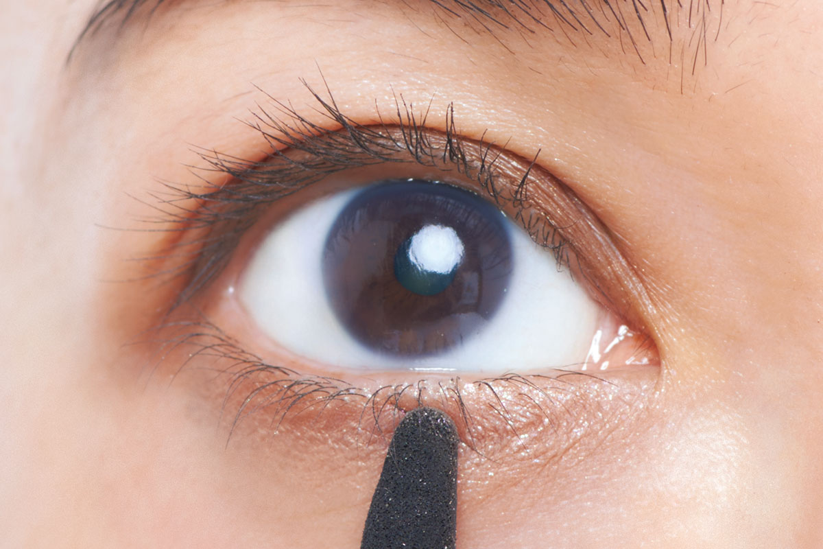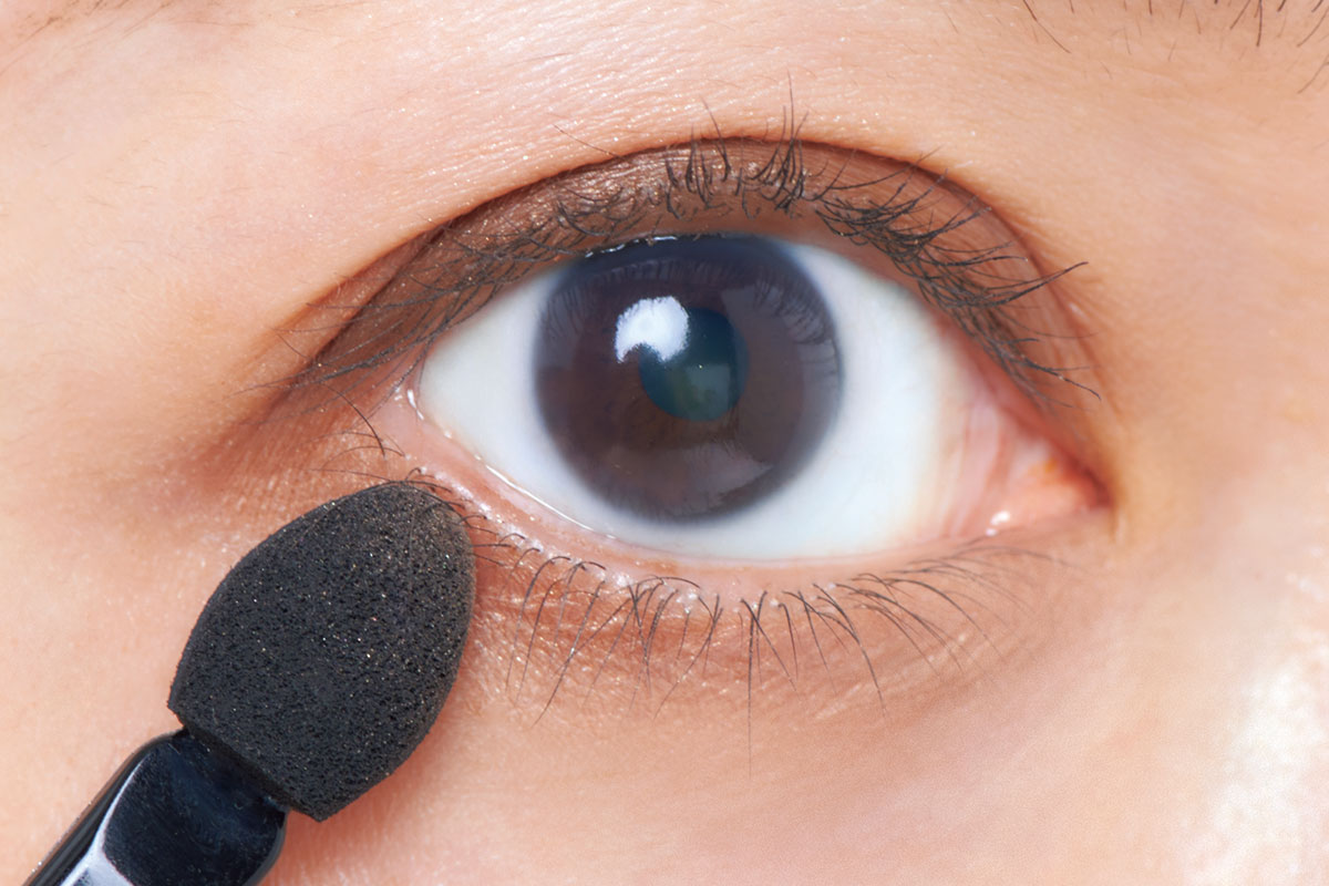 c.を太いチップに取り、下まぶたのキワの目尻から黒目の手前までライン状に引きます。ニュアンスと奥行きがプラスされ、印象的な目元に。