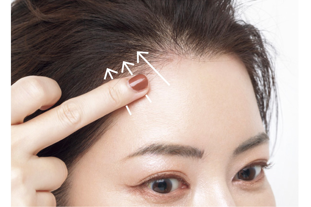 額の左右の生え際に影を作ることで顔がぐっと小さく見えます。シェーディングをのせたら、上に向かって指で叩き伸ばしましょう。