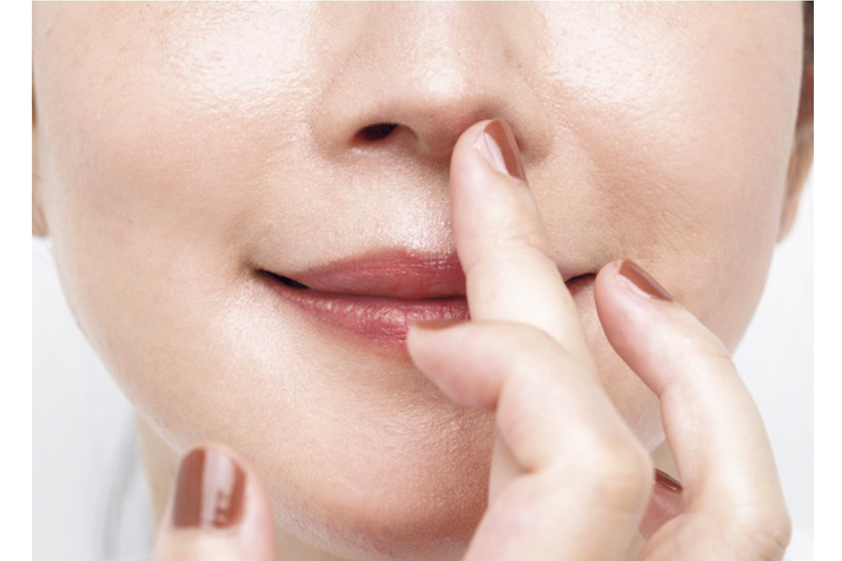 鼻頭だけではなく、鼻柱にもシェーディングをのせ、広げずに馴染ませて。ここに影を作ると人中が縮まり、顔の縦幅が大幅に短く。