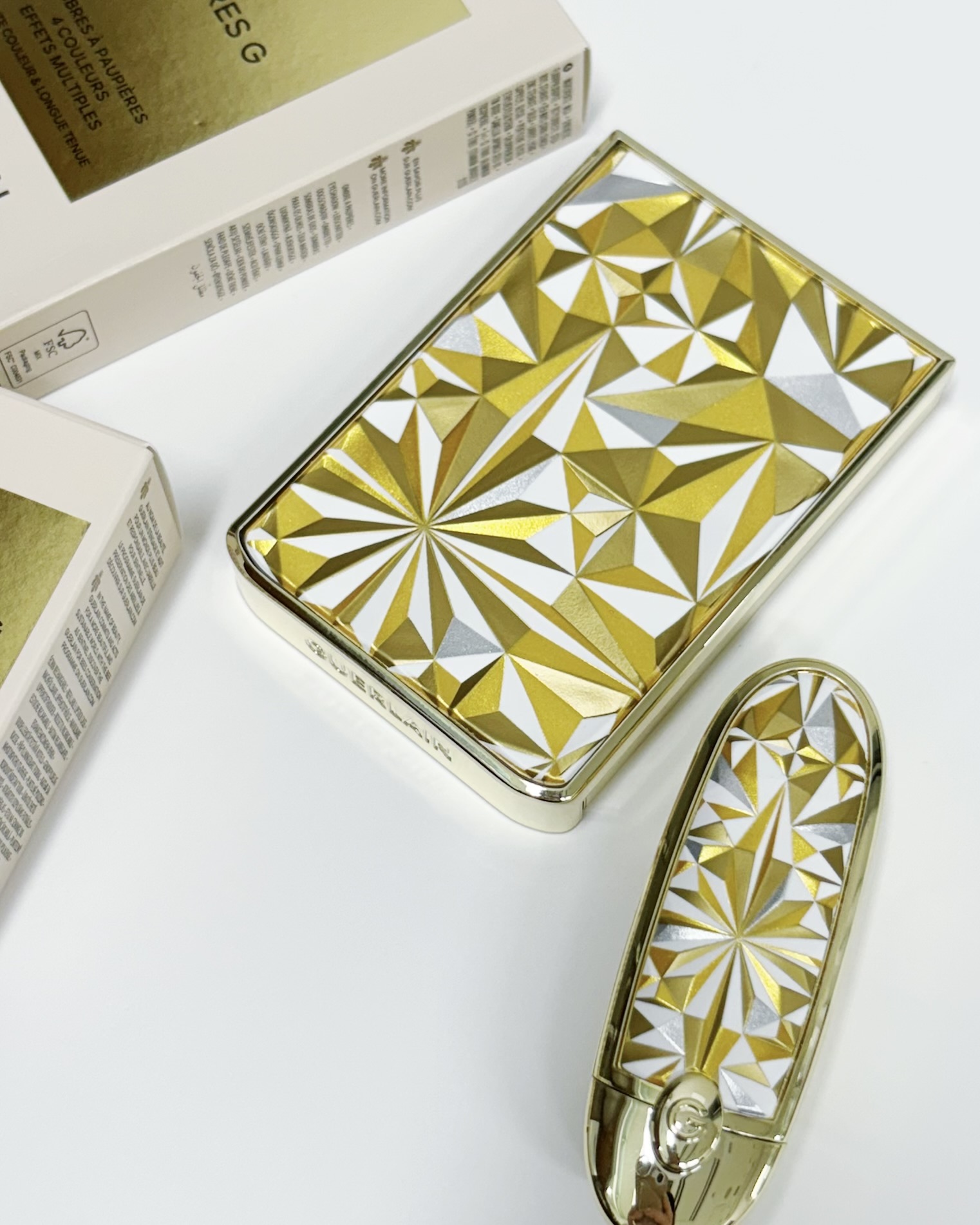シマーゴールド、スパークリングシルバー、ウォーム ヌード、ブラウンのニュアンスが重なり合い、華やかで煌めく目元に。