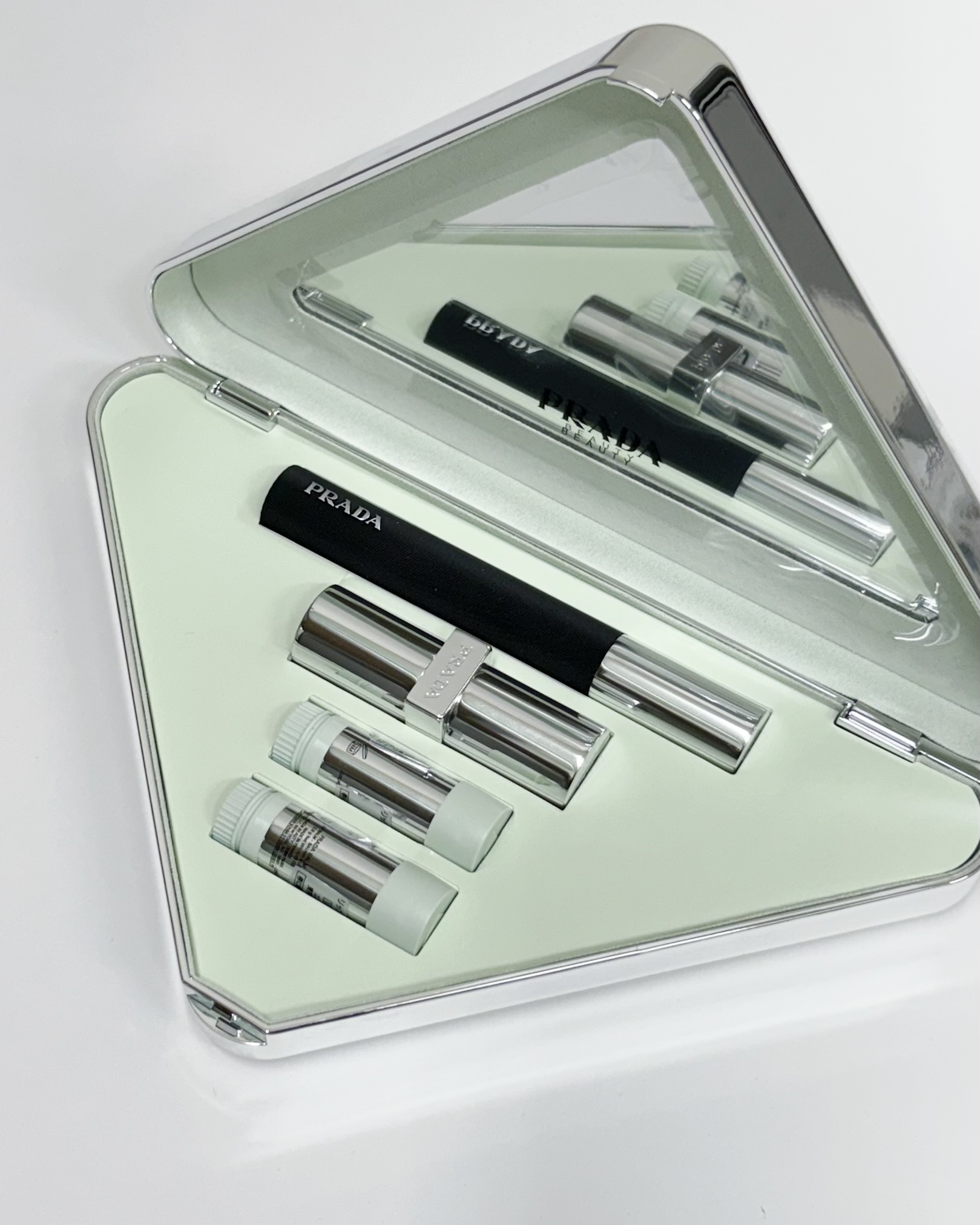 トライアングルのメタルケースにはアイコンリップスティック3種とマスカラがIN。