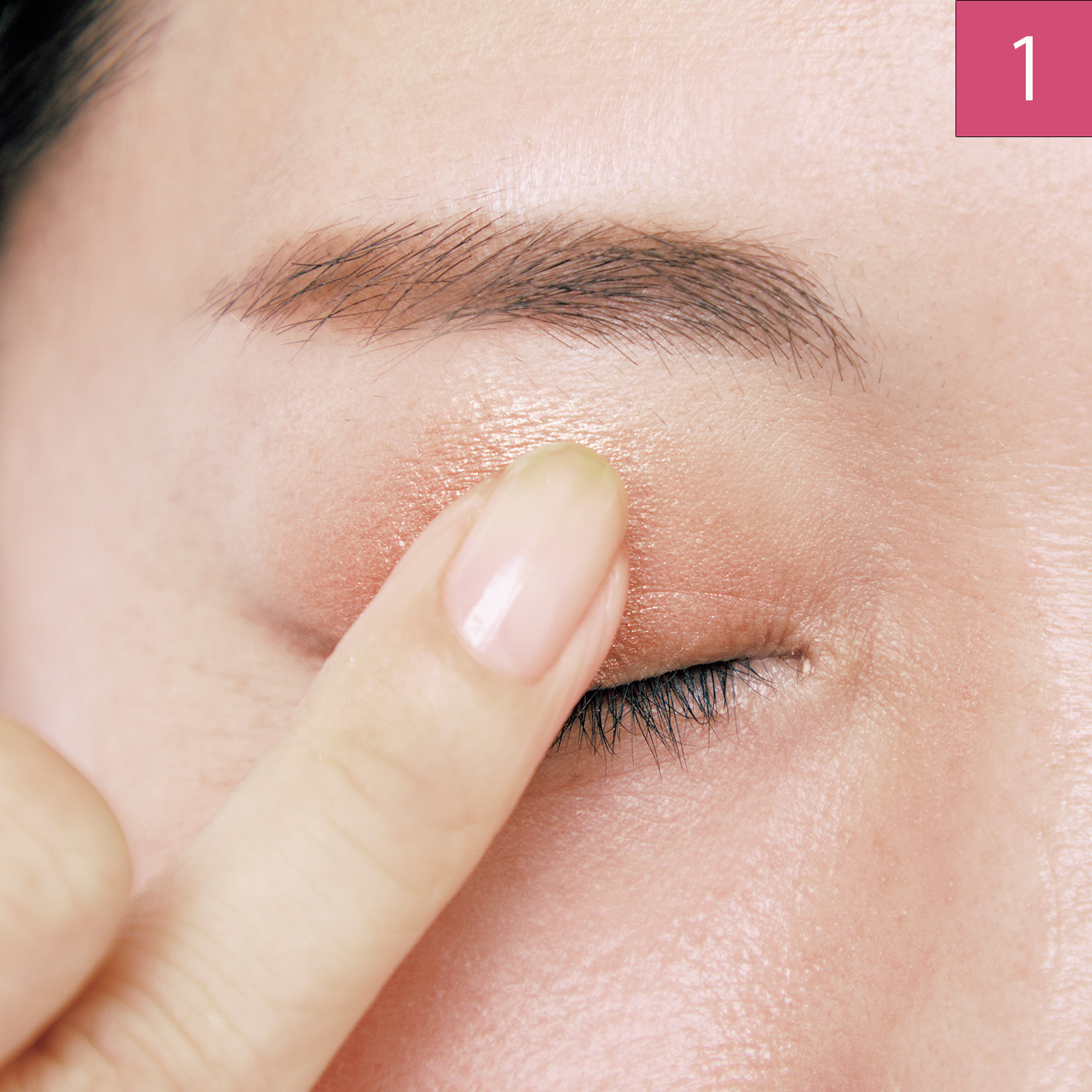 指でアイシャドウをまぶた全体に塗り広げる。さらにまぶた中央に、指でポンポンと重ね塗りをする。