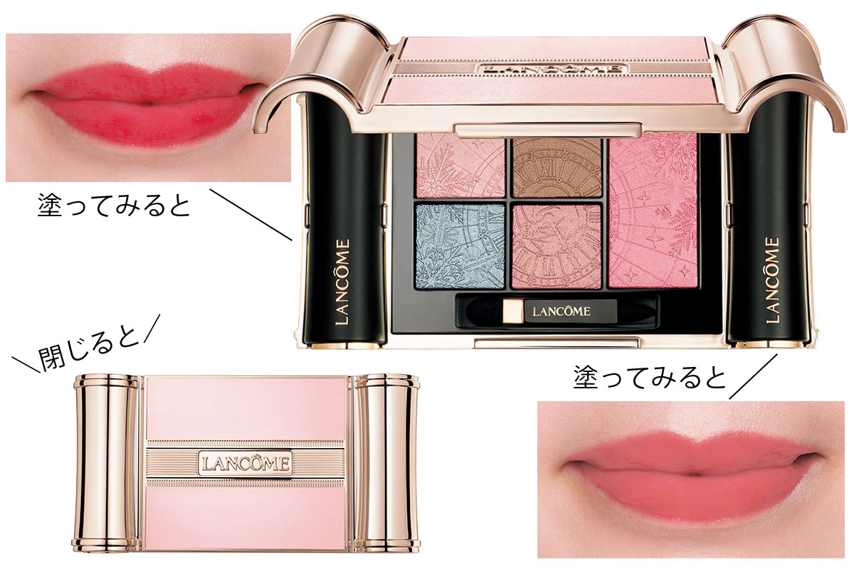 時計のエンボスが繊細に施されたカラーパレットのサイドには、ラプソリュ ルージュの現品サイズが2本もセット。組合わせしだいで何パターンものメイクアップが楽しめるので、ホリデーシーズンをフルで満喫できそう。ケースを閉じると、旅のお供に相応しい双眼鏡のようなデザインのパッケージもユニーク。ザ ピンク ジャーニー プレミアム パレット ¥20,900(ランコム)