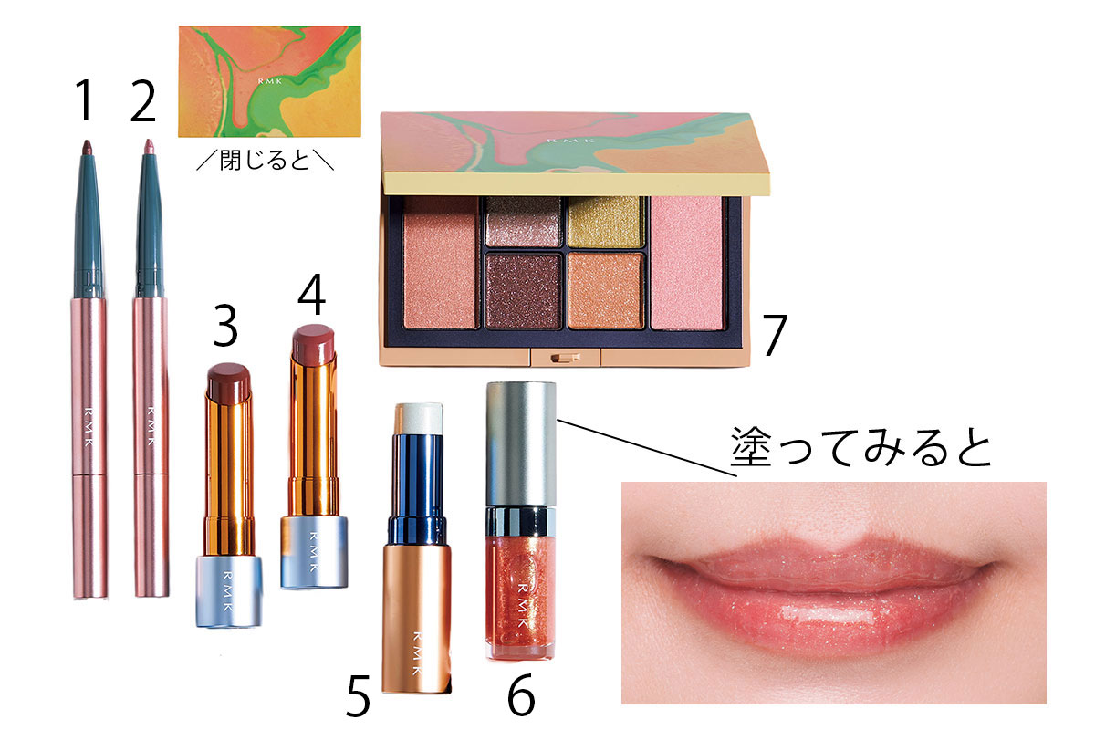 温もりのあるカラーが勢揃い。1.2 RMK アイディファイニング ペンシル EX-07、EX-06 各¥3,300、3.4 RMK ベルベットシーン リップカラー EX-05、EX-04 各¥4,400、5 RMK ラディアントカラースティック EX-03 ¥3,630、6 RMK リップ ルミナイザー EX-04 ¥3,520、7 RMK ブリーズ ブリス エスケープ アイズ & ブラッシュ パレット ¥8,250(すべてRMK Division)
