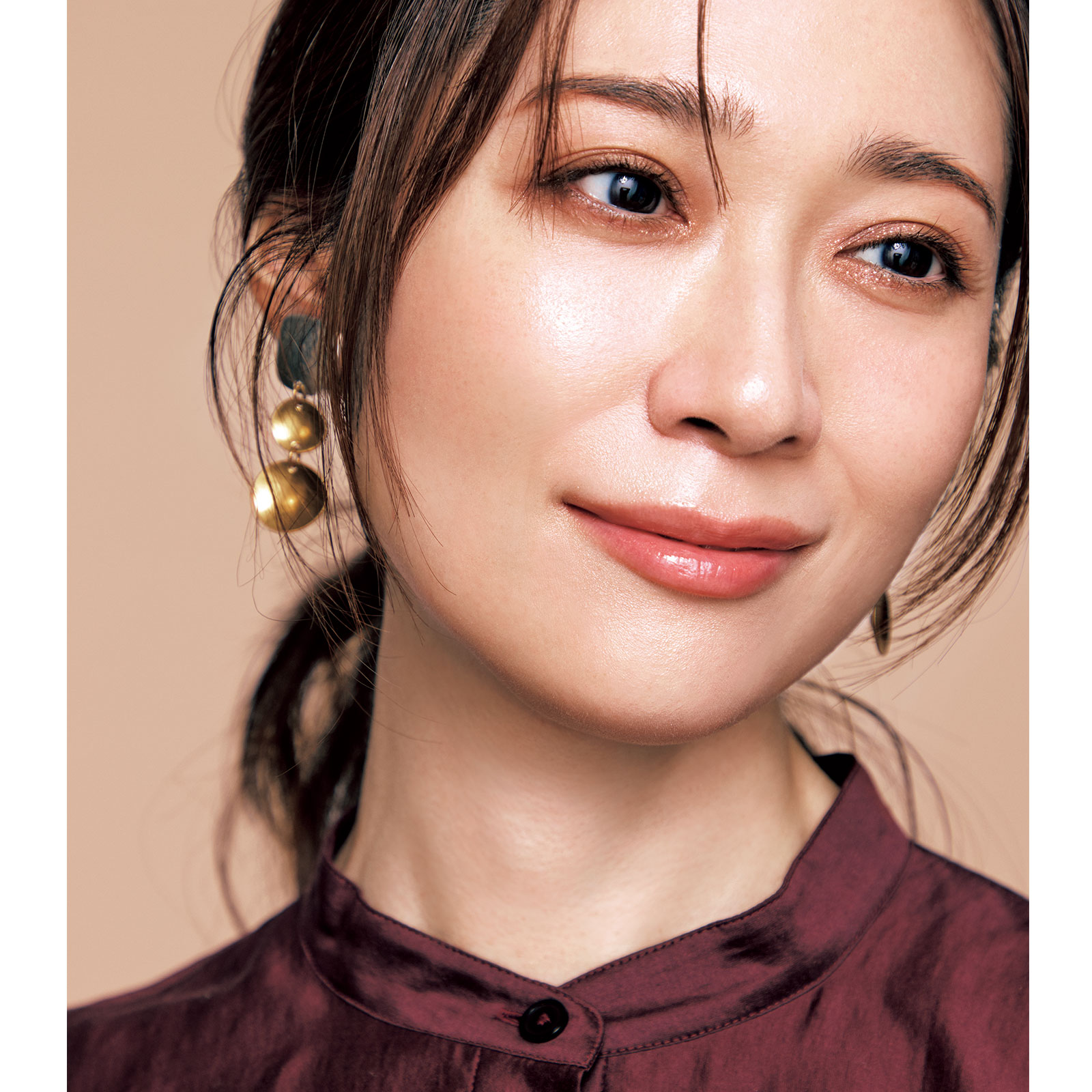 ボルドーブラウス¥7,990(アンフィーロ)イヤリング¥11,000〈マージョリー・ベア〉(ココシュニック新宿タカシマヤ店)