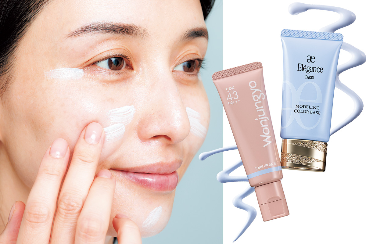 右:〈モデル使用分〉自然に肌に溶け込み色補正。みずみずしいツヤを与え、毛穴や凹凸もカバー。エレガンス モデリング カラーベース BU300 SPF25・PA++ 30g ¥5,500(エレガンス コスメティックス)
