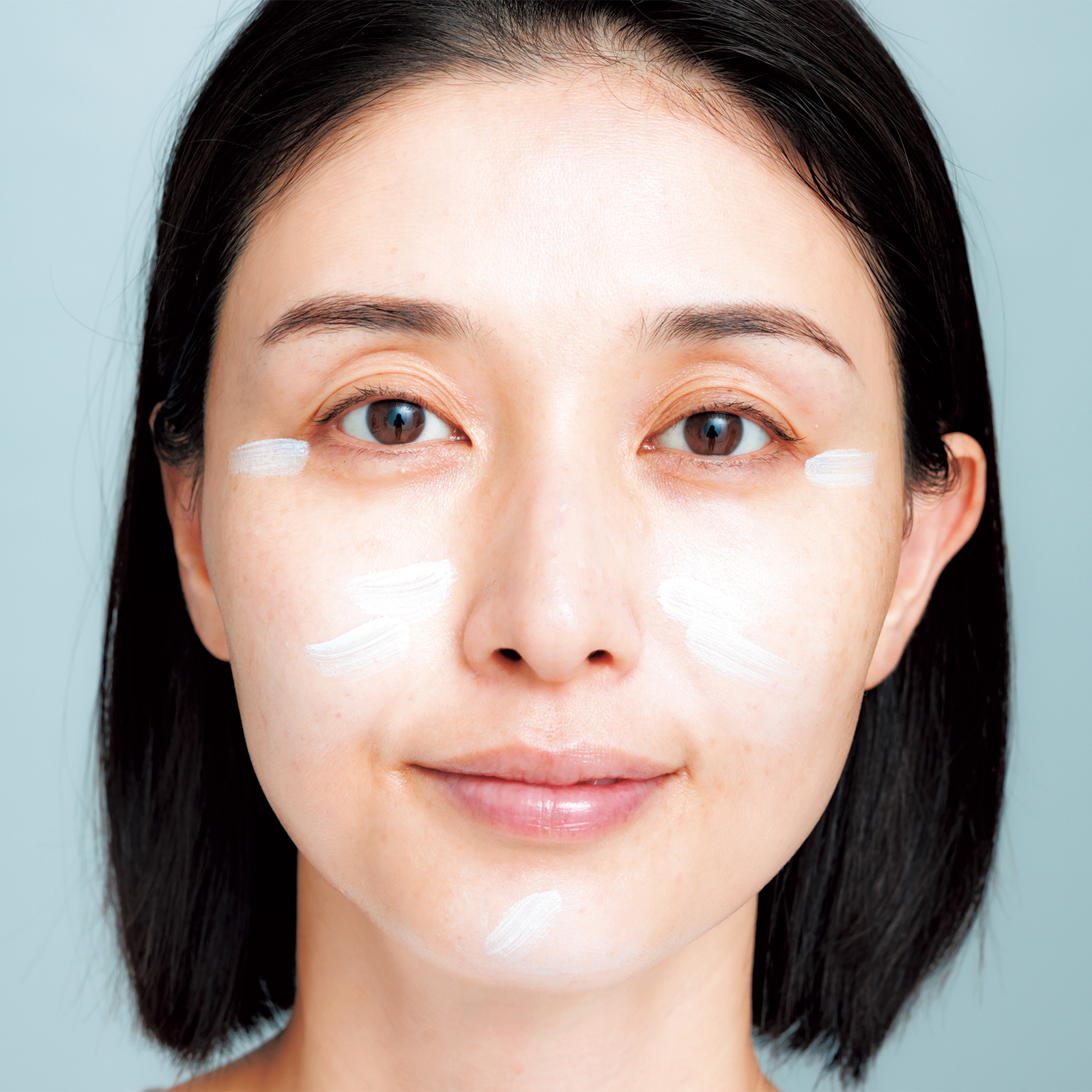 カラーベースの前にうるおい下地を全顔にたっぷり塗布。肌がふっくら見え、毛穴目立ちや乾燥によるくすみも緩和。メイク前に毛穴やキメを整えるスキンケアを投入すれば万全。