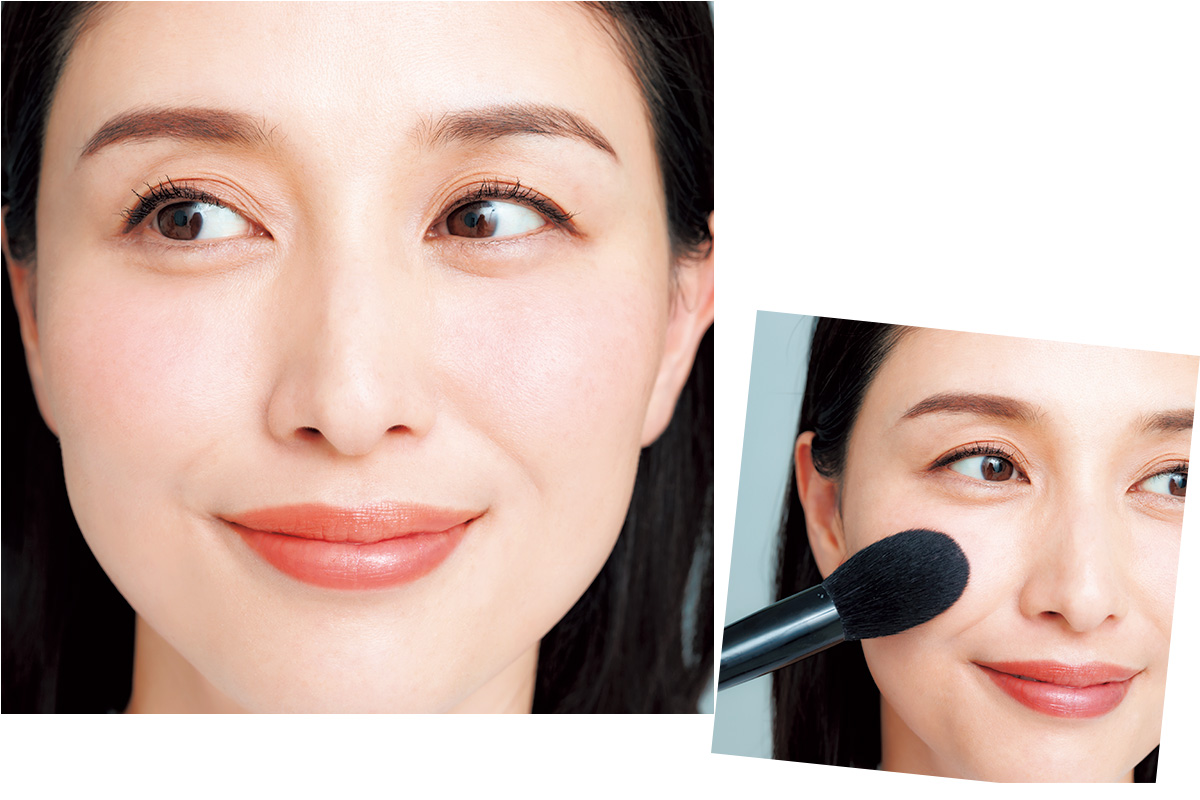 頰の血色感は肌を持ち上げて見せる効果があり大人ほど不可欠。青みピンクがくすみ肌に有効です。頰の高い位置にクマと重ねるように塗布。練りとパウダーのWチークが◎。