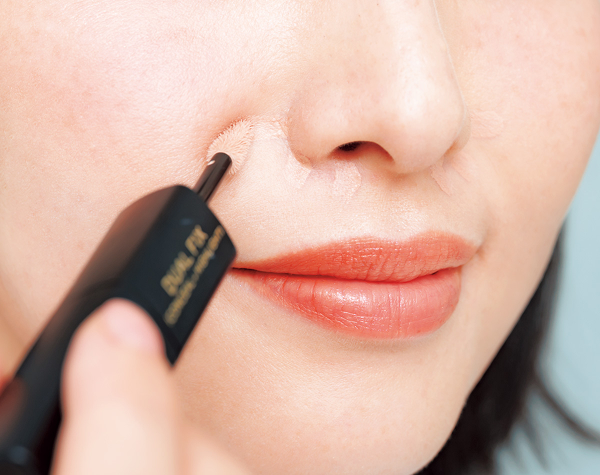 口周りのもたつきは、ほうれい線を直接触るより、鼻周りのくすみを整えるほうがキレイ。コンシーラーを必要な場所に少量を塗布。口角もリフトアップ。