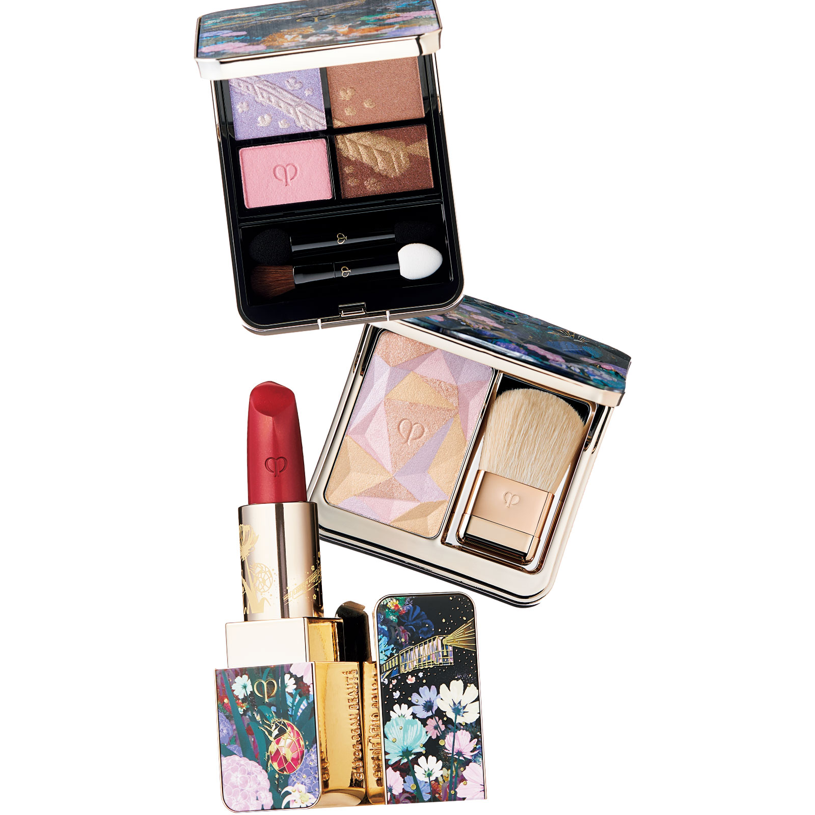夜の街や照明が落ちたムードのある空間でも、しっかりと顔立ちが映える、大人のカラーメイクを叶えるキーアイテムが登場。クレ・ド・ポー ボーテ オンブルクルールクアドリ 504 ¥10,340、クレ・ド・ポー ボーテ ル・レオスールデクラ 110 ¥9,350、クレ・ド・ポー ボーテ ルージュアレーブル 527 ¥7,150(すべてクレ・ド・ポー ボーテ)