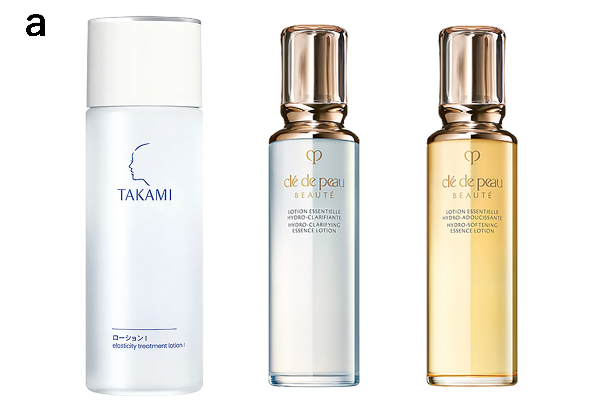 左から:ベタつきと乾燥が気になる時に。角層のすみずみまで潤いを届け素早く肌に馴染む。タカミローションⅠ 100ml ¥4,070(タカミ)みずみずしい潤いで肌を満たし、透明感あふれる肌に。ローションエサンシエル C 170ml ¥14,300、発酵エキスを独自の浸透技術で角層深部に。肌荒れをや乾燥を防ぎツヤやかな肌に。ローションエサンシエル A 170ml ¥14,300 (ともにクレ・ド・ポー ボーテ)
