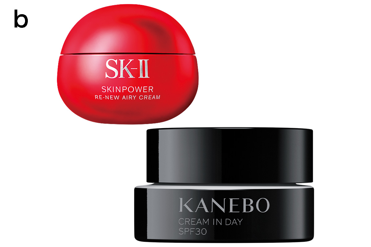 上から:エイジングサインを丸ごとケア。軽やかな質感でふっくらハリ肌に。SK-II スキンパワー リニュー エアリー クリーム 50g ¥18,700〈編集部調べ〉(SK-II)日中の肌を潤いで包み、柔らかなハリツヤ肌に。化粧下地にもOK。カネボウ クリーム イン デイⅡ[医薬部外品]SPF30・PA+++ 40g ¥9,350(カネボウインターナショナル Div.)