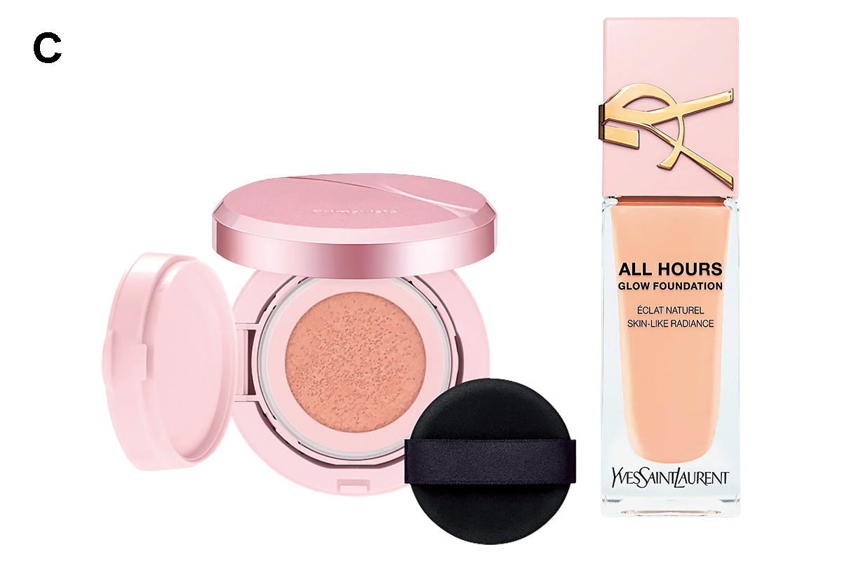 左から:重ねて伸ばすだけで簡単に厚塗り感のない仕上がりに。プリマヴィスタ グロウカバー クッション SPF11・PA++ ¥4,400(セット価格)〈編集部調べ〉(花王)極薄膜で肌に均一に密着し、毛穴などの肌悩みをカバー。マカダミアナッツオイルが美しいツヤをもたらす。オールアワーズ リキッド グロウ 25ml ¥8,360(イヴ・サンローラン・ボーテ)