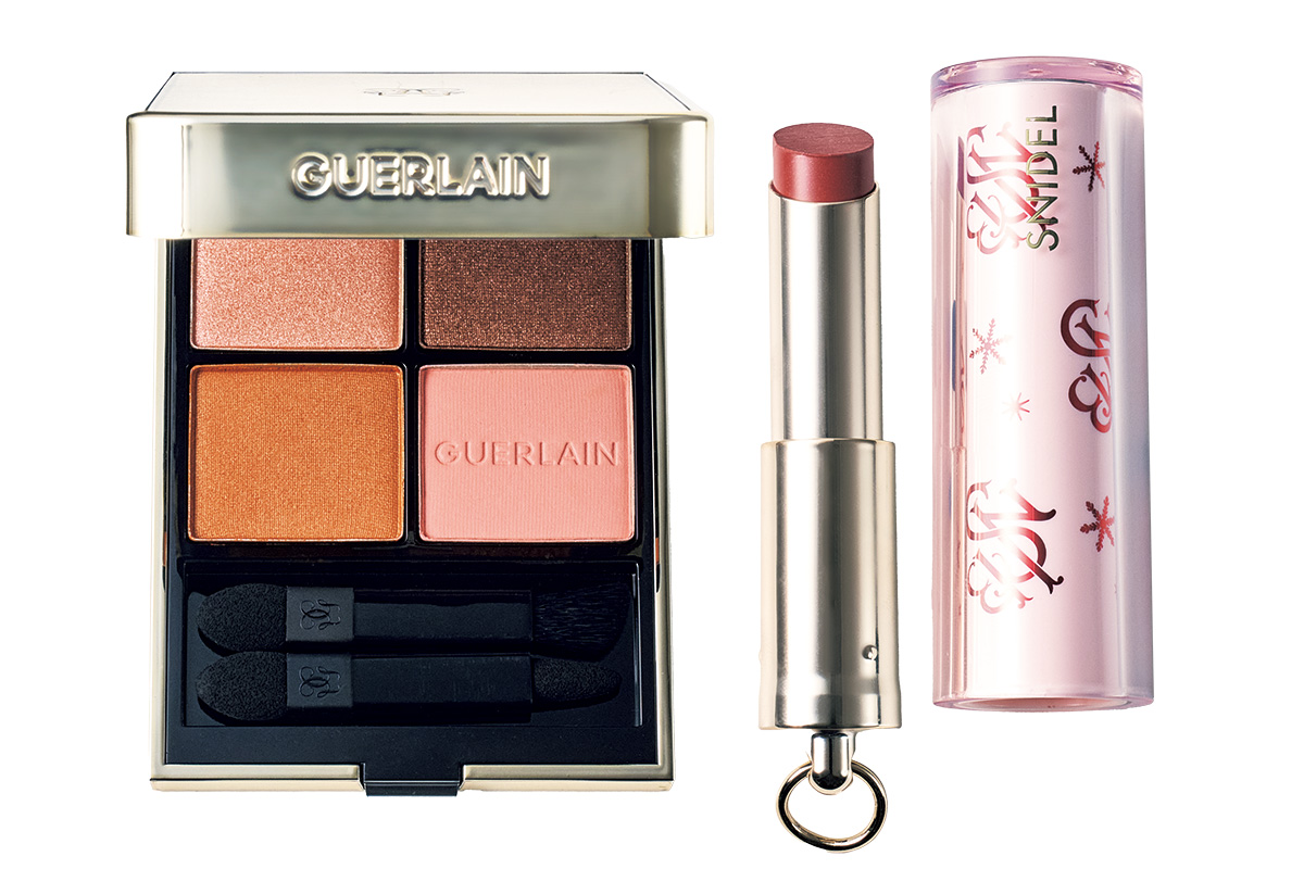 ポイントメイクは温かみのあるカラーでさらに好印象。左:ピンクとブラウンの温かみのある色味。オンブル ジェ 129 ¥10,780(ゲラン)右:唇の体温でとろけるメルティルージュ。透け感のある大人ピンクでナチュラル美人に。SNIDEL ルージュ クチュール コフレ cheers Again EX07 ¥3,850*限定販売(スナイデル ビューティ)
