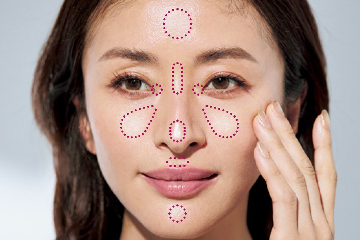 写真の赤丸部分に、指先に取ったハイライトの右の色を少しずつのせて。ラフに指で点々とのせれば、つけすぎてテカテカになることもなし。