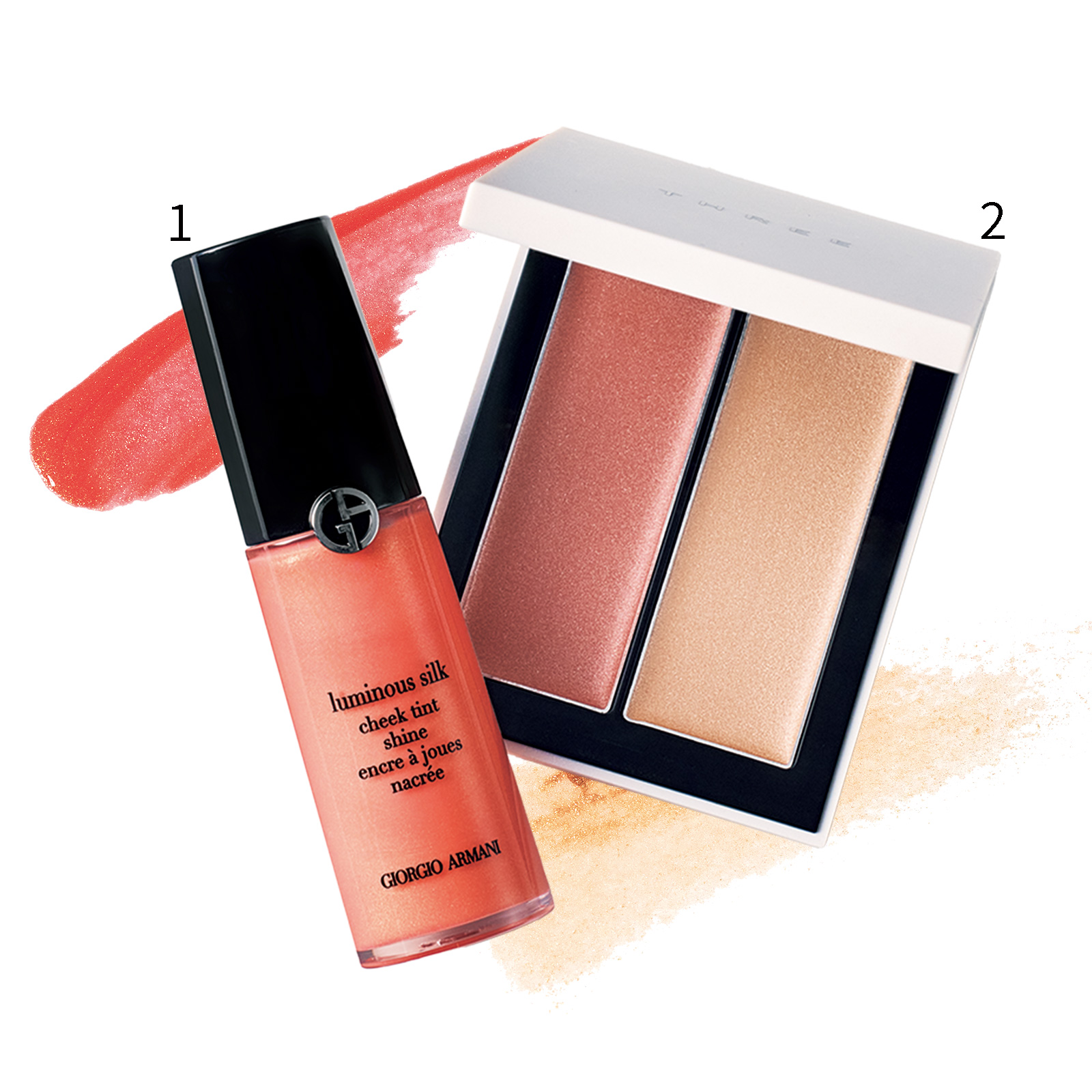 左:チークは肌に溶け込むようになじむリキッドタイプを選んで。1.ルミナス シルク チーク ティント シャイン 50S ¥7,480(アルマーニ ビューティ)