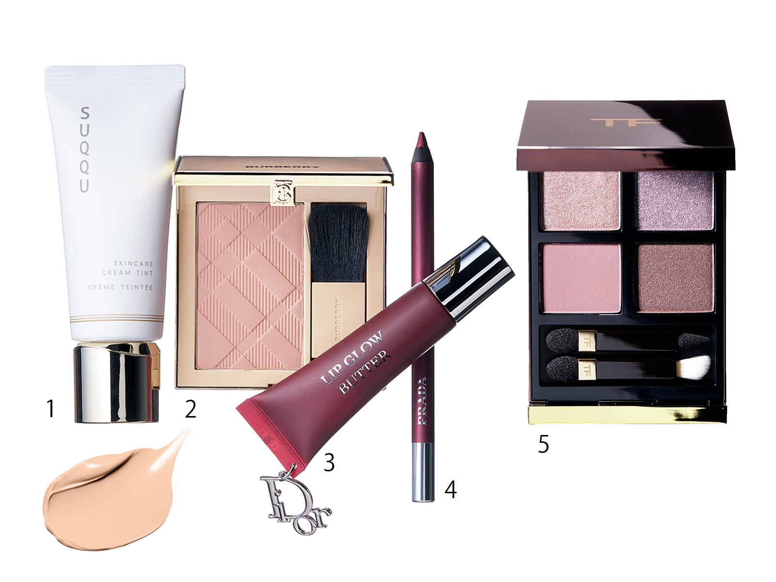 11.保湿クリーム仕立てで、使うほど肌の水分量がUP。軽やかな使用感で素肌の延長線上のような仕上がりに。スキンケア クリーム ティント SPF38/PA++ 40g ¥8,250(SUQQU) 2.引き締め効果も期待できる、ほんのりピンクを感じるサンドベージュ。バーバリー アウトドア ブラッシュ 11 ¥7,590(バーバリー ビューティ) 3.ジューシーな発色とツヤで唇を彩る。深みカラーもシアーな発色なので怖見えしない。ディオール アディクト リップ グロウ バター104 ¥5,060(パルファン・クリスチャン・ディオール) 4.スルスルのびて肌にフィット。テクニック要らずでぼかしも自在。ラインズ デュラブル グライディング アイペンシル 03 ¥4,730(プラダ ビューティ) 5.【KEY ITEM】しっとりとした質感で見た目どおりの美しい発色。過去に人気を博したカラーの復刻版。星屑をちりばめたようなグリッターとモーヴブラウンが1パレットに。アイ カラー クォード 27 ¥13,640 (トムフォード ビューティ)