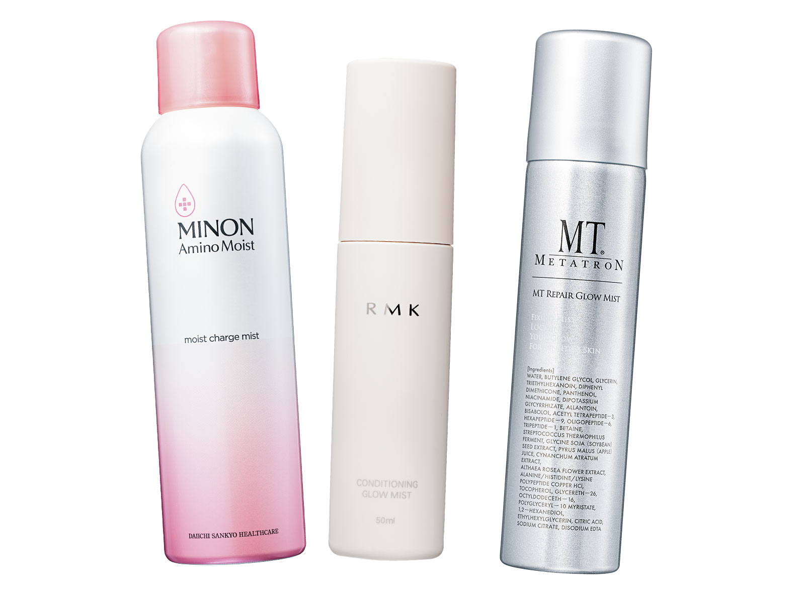 左から:吸着ヒアルロン酸配合。角質層まで浸透し保湿。ミノン アミノモイスト モイストチャージ ミスト150g ¥2,090〈編集部調べ〉(第一三共ヘルスケア)オイルとうるおいの2層式タイプ。乾燥による崩れや毛穴落ちを防ぎ透明感が復活。RMK コンディショニング グロウミスト50ml ¥3,300(RMK Division)霧のように超微細なミスト。美容成分たっぷりのうるおいが重なり、しっとり肌に。MTメタトロン MT リペア グロウ ミスト 60ml ¥5,940(MTコスメティクス)