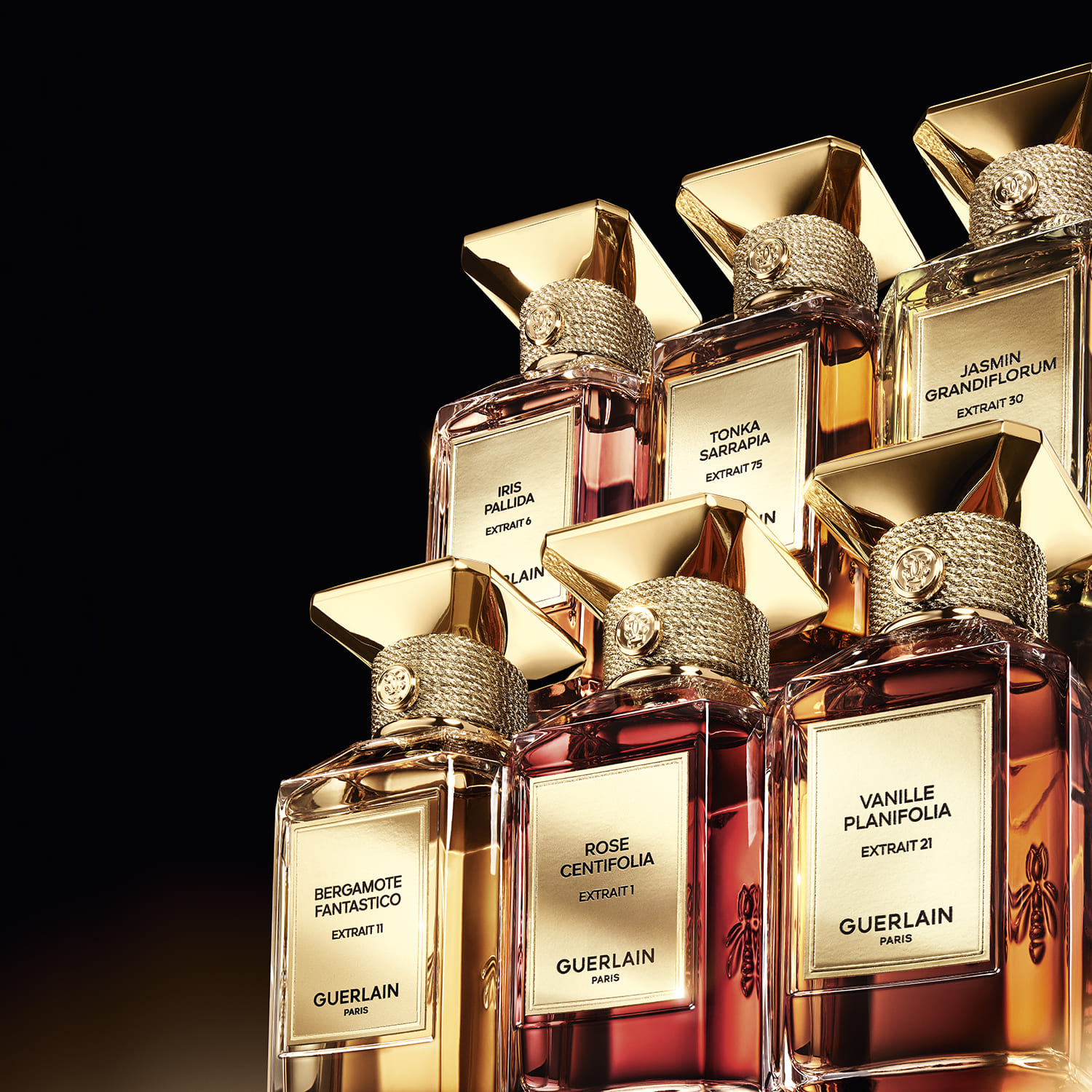 <ラール エ ラ マティエール エクストレ>コレクションは、メゾンを象徴するシグネ チャー「ゲルリナーデ」を再解釈して2023年に創出されました。6つの素材を見つめ直し、それぞれの黄金比を追及した6つのアコードは、各原料が持つ完璧で比類なき、この上なくゲランらしい香りを体現したもの。貴重なリキスを高度に濃縮し、独自のフォーミュレーヌョン技術によって編み出された至高のフレグランスは、1世紀以上にわたりメゾンを支え、数多のインスピレーションを湧き立ててきました。単独ではもちろん、2種以上を組み合わせても楽しめる<ラール エ ラ マティエール エクストレ>のフレグランスを纏えば、ゲランの調香師のように自らのパーソナリティを映し出し、世界にひとつの「ゲルリナーデ」を演出できます。
