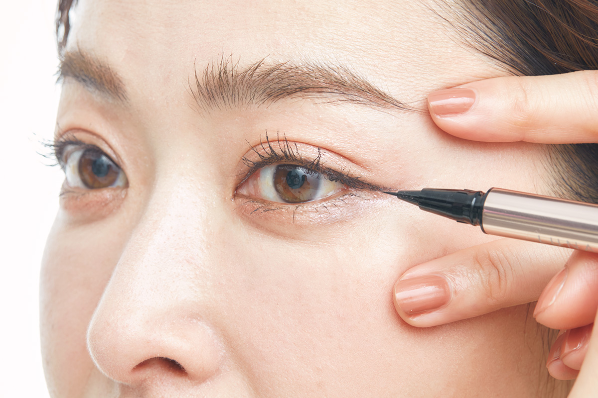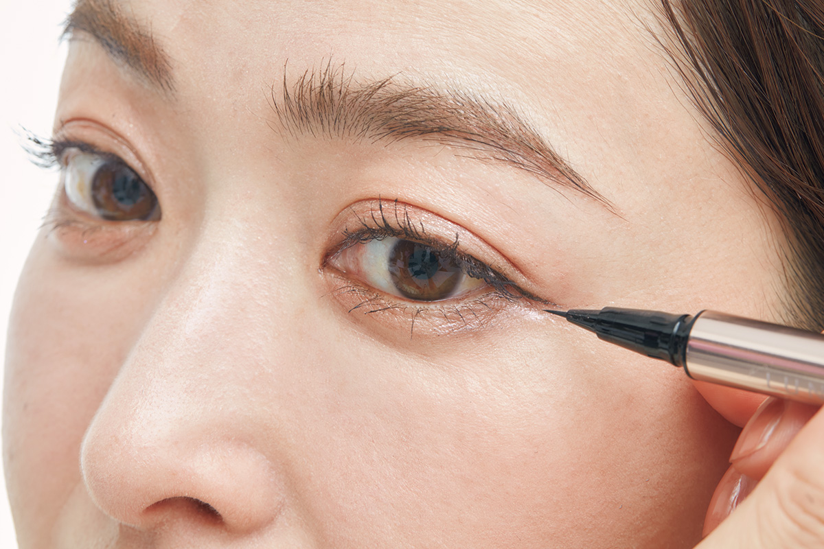 アイライナーを鉛筆持ちしたら、影をつけるようなイメージで線を引くと自然な仕上がりに。