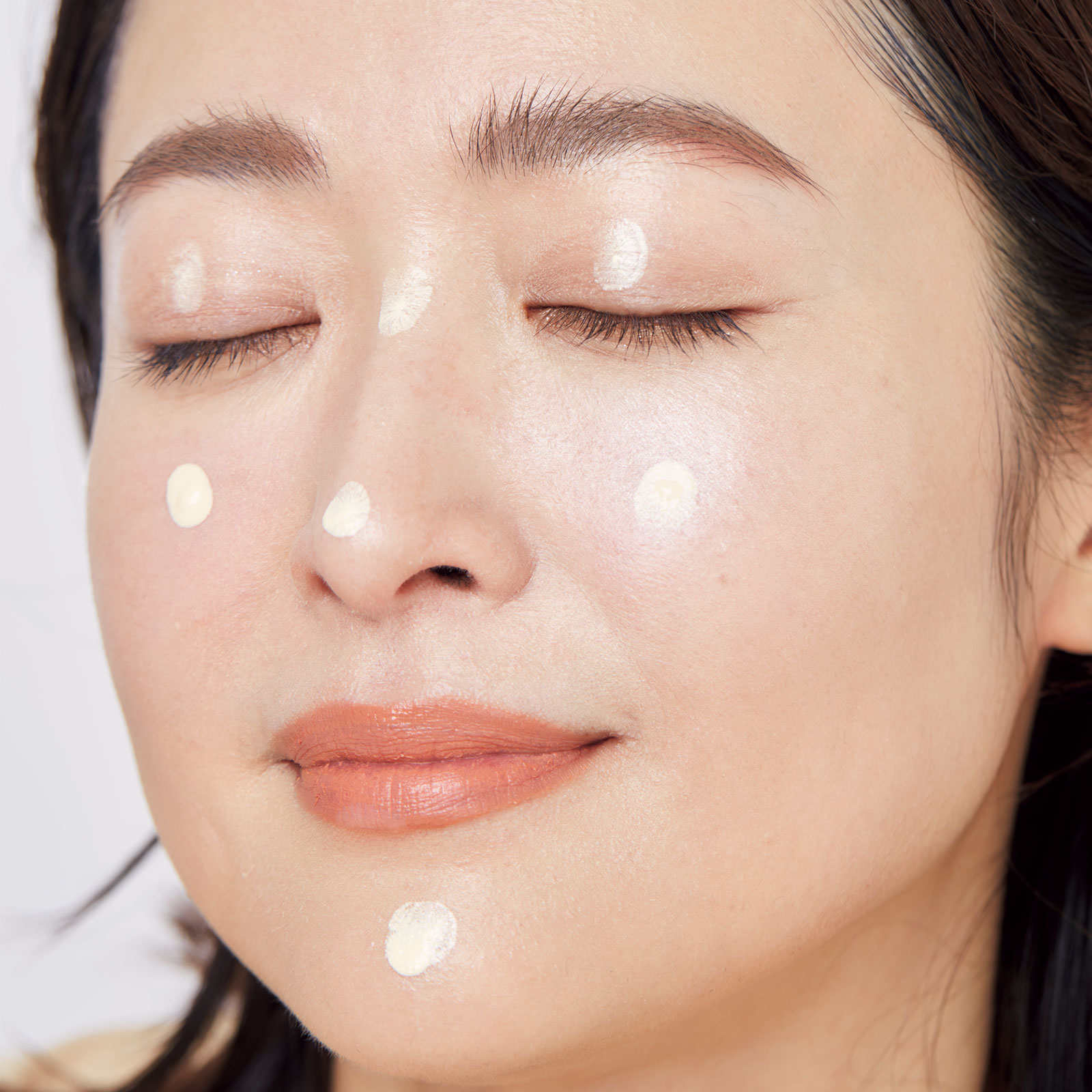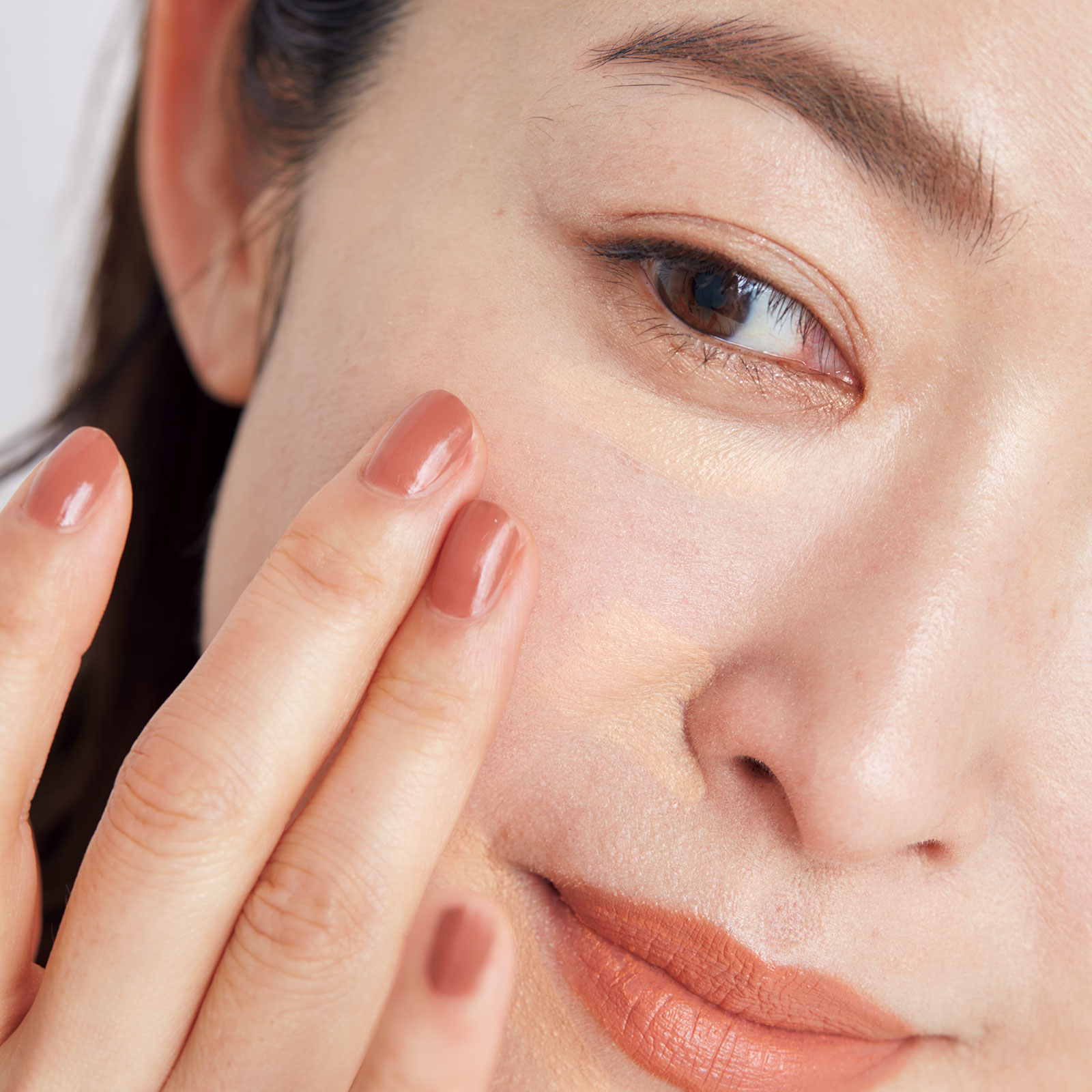 まぶたや頰、鼻先や顎に下地をオン。まぶたにのせることでくすみをカバーし、アイメイクの仕上がりがさらに美しく。