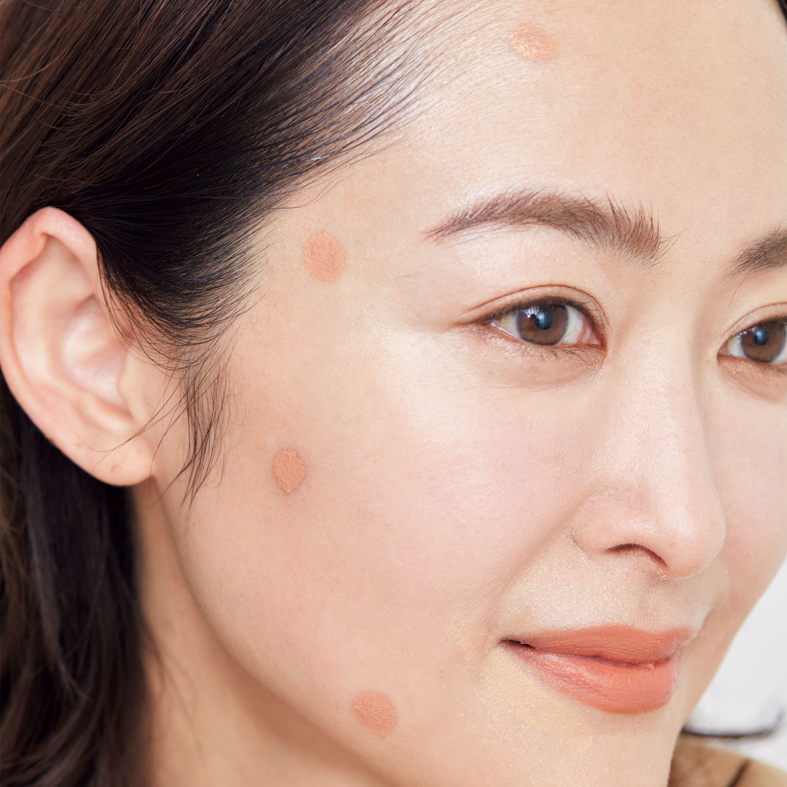 イエローベースで、ワントーン肌が明るくなるので、選ぶファンデは標準色がオススメ。顔の外側に3か所、点置きします。