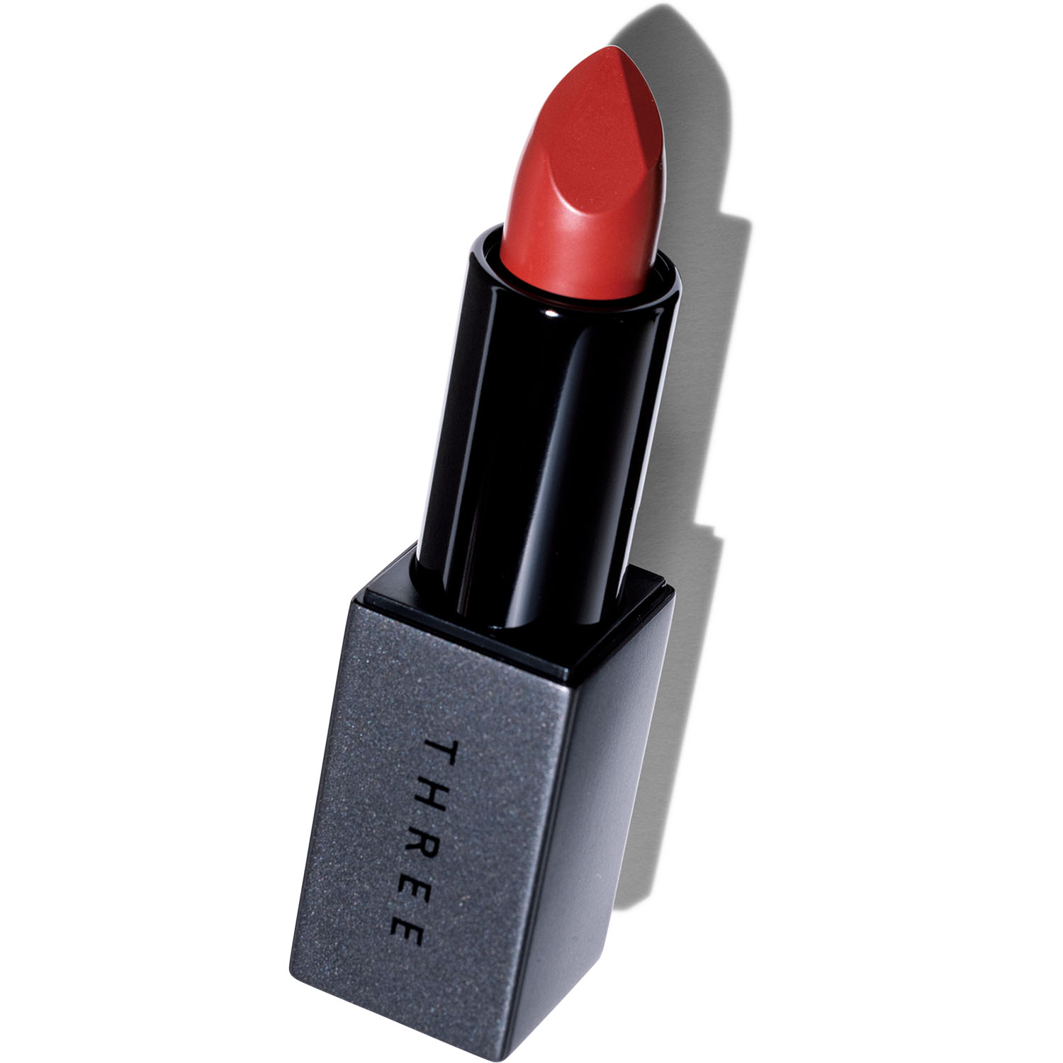 ブルーの高輝度な隠しパールが入った、レッドブラウン。バームのような質感でフィットし、潤いを底上げ。THREE ドリームオン アリューリング リップスティック 08 ¥4,400(THREE)