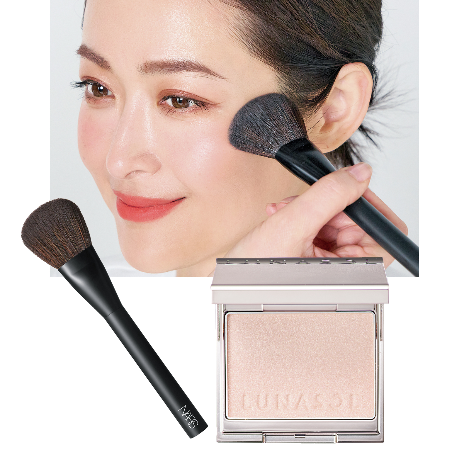 大きめのブラシにチークをとり、1で入れたチークのまわりに薄く重ねてから、頰全体へブラシを滑らせるように馴染ませます。ごく薄く重ねることで、ファンデやオレンジリキッドチークの色が肌と自然に一体化し、ほのかに上気したような仕上がりに。ピンクみを帯びたベージュトーンのチークは、透明感を引き出しながらクリアな肌に。(左)NARS ブラッシュブラシ #16 ¥6,160(NARS JAPAN)、(右)LUNASOL カラーリングブリーズ 06 Misty Aura ¥4,840 ※セット価格(カネボウ化粧品)
