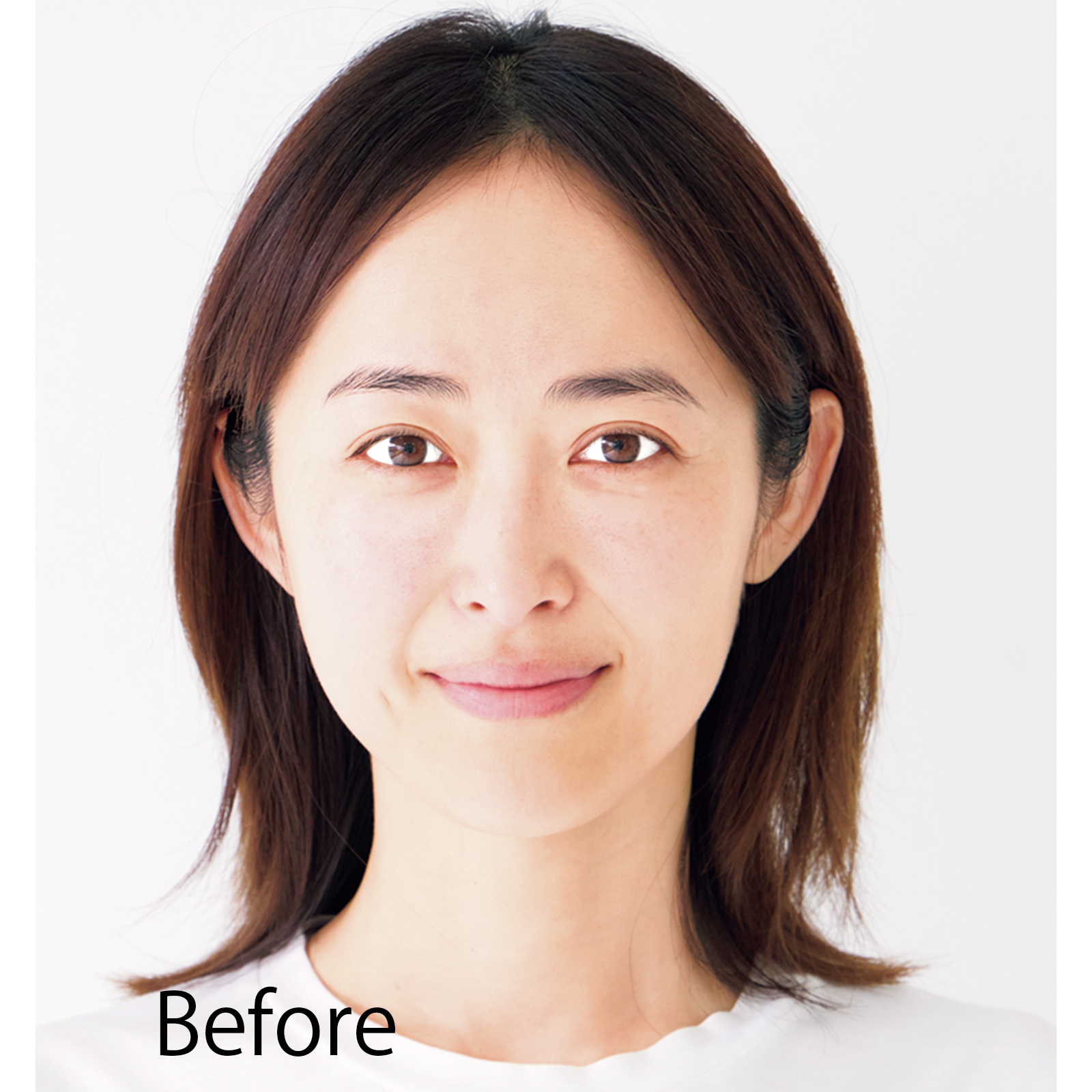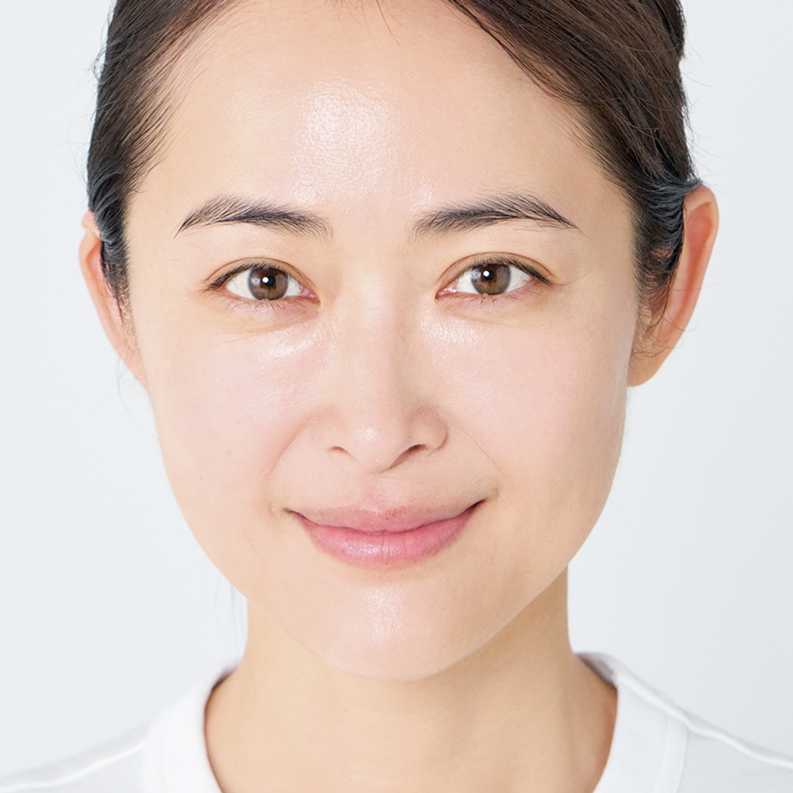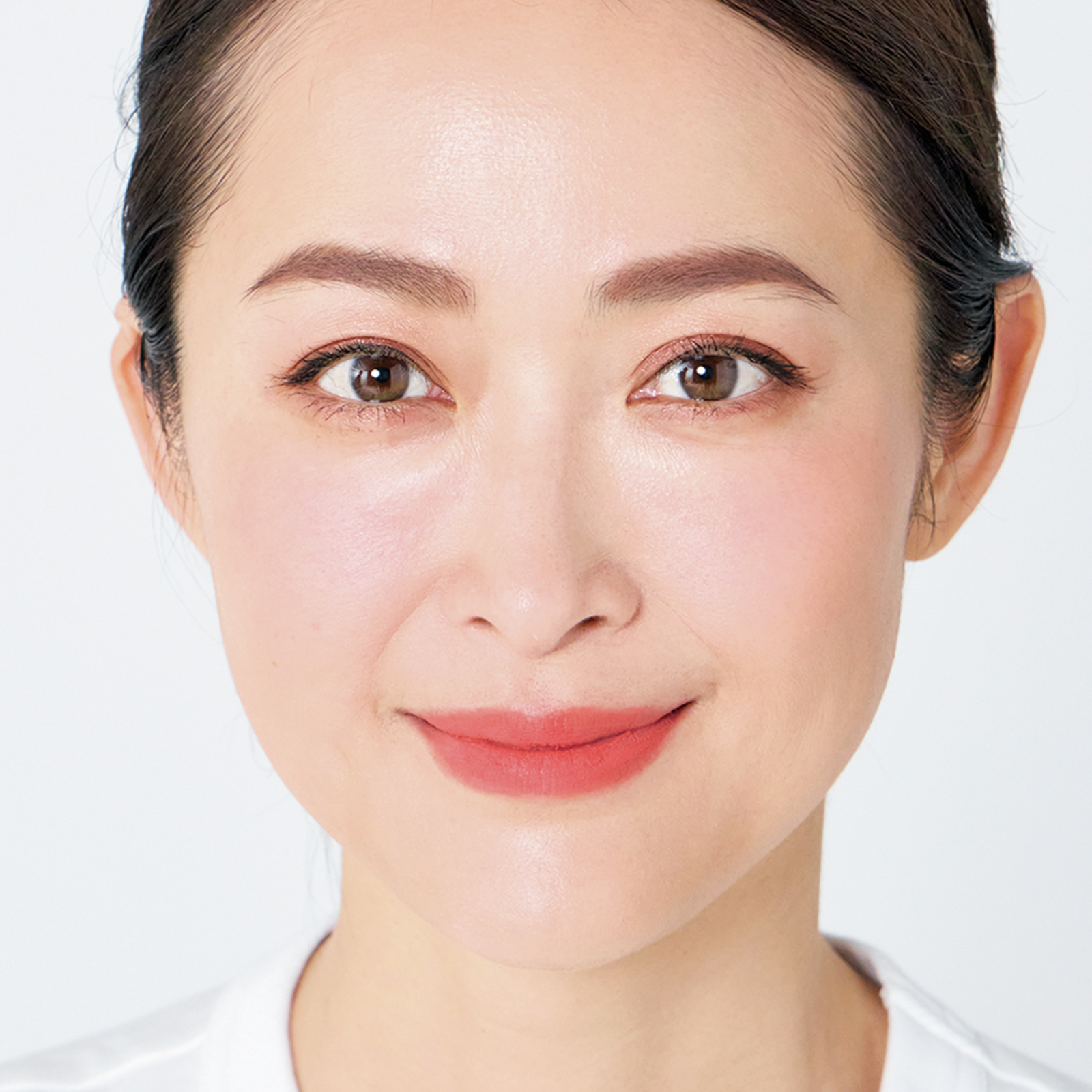 ベースで透明感のある肌に自らの血色のような健康的なオレンジチーク。若い頃の骨格と横のラインを意識して入れることで中顔面短縮の効果も期待できます。他のパーツもトーンを揃えると、バランスよく抜け感のある洗練された表情に。頰の上気でメイク全体が調和すると、気持ちまで上向きます!