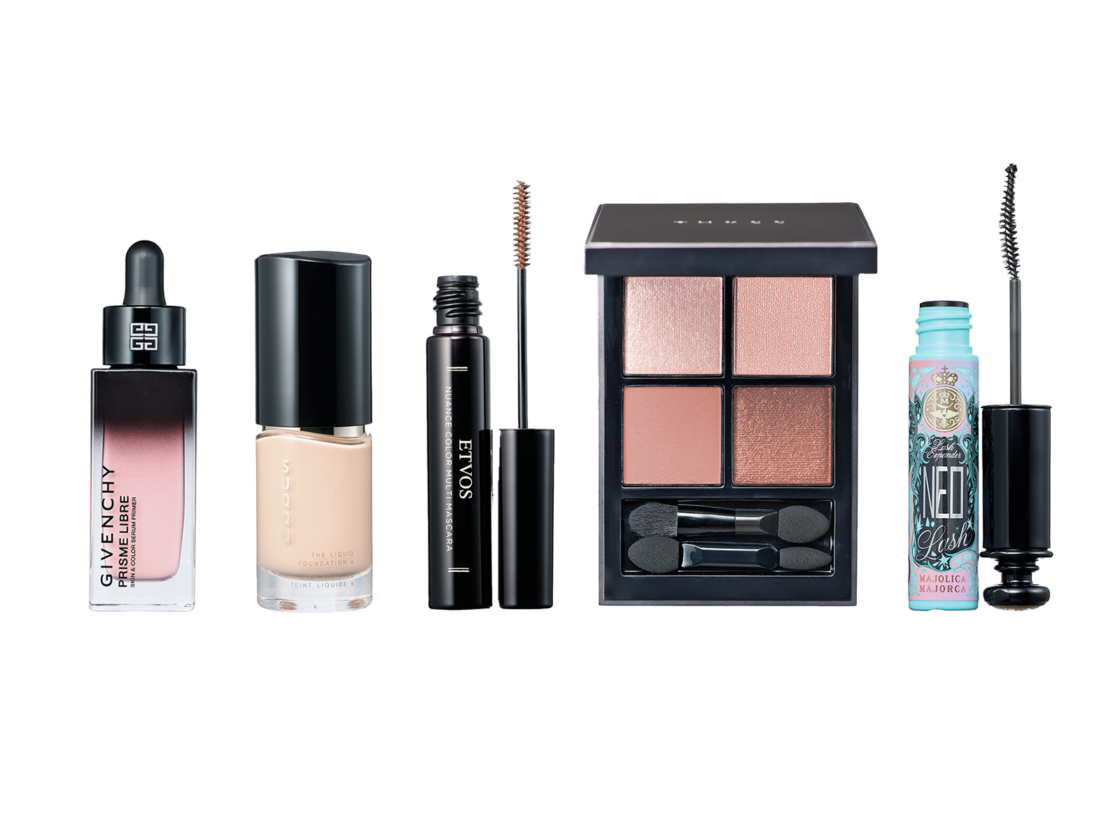 (左から)くすみを補整して透明感を叶えるピンク色のベース。プリズム・リーブル・ケア&カラー・セラム・プライマー ピンク 30ml ¥7,700 ※2/1発売(パルファム・ジバンシイ)、端正なツヤ肌印象に。SUQQU ザ リクイド ファンデーションe 115 SPF20・PA+++ 30ml ¥11,000 ※2/6発売(SUQQU)、眉の存在感を引き立て、アイシャドウと馴染む茶色を。ニュアンスカラーマルチマスカラ ベーシックブラウン ¥2,970(エトヴォス)、目元は4つの質感のトープカラーで品よく。THREE スターゲージングアイシャドウクアッド 09 FLOWER SPACE ¥7,480(THREE)、繊細まつ毛で印象的な目元に。マジョリカ マジョルカ ラッシュエキスパンダー ネオラッシュ¥1,760〈編集部調べ〉(資生堂)