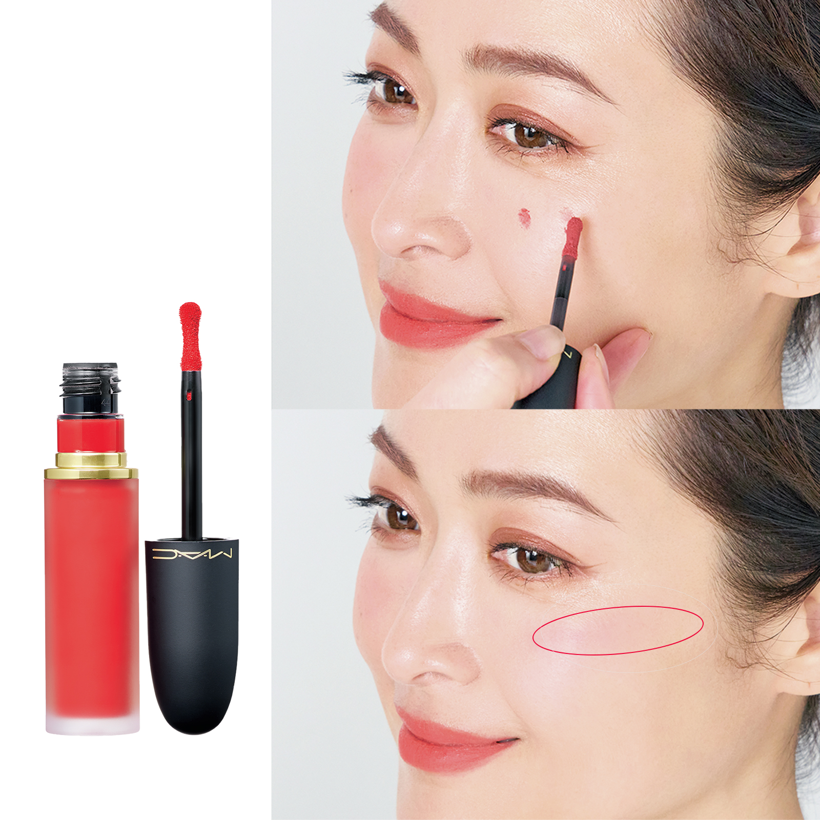 (上)まず頰の高い位置と黒目の下を結んだあたりを起点に、チップで2点置き。(下)指先で真横に広げるようにぼかし、さらに目尻側へ広げて伸ばすと、頰が高く見え、フェイスラインもシャープに。チークの前にリップを塗っておけば塗りすぎずキレイに。唇に直塗りし、中央に重ねづけしたあと、輪郭を軽くぼかして馴染ませます。マルチに使えるオレンジ系が大人の肌をくすませず小顔効果も。M・A・C パウダー キス リップ+チーク ムース クリームシクル ¥4,840 ※1/9発売(M・A・C)
