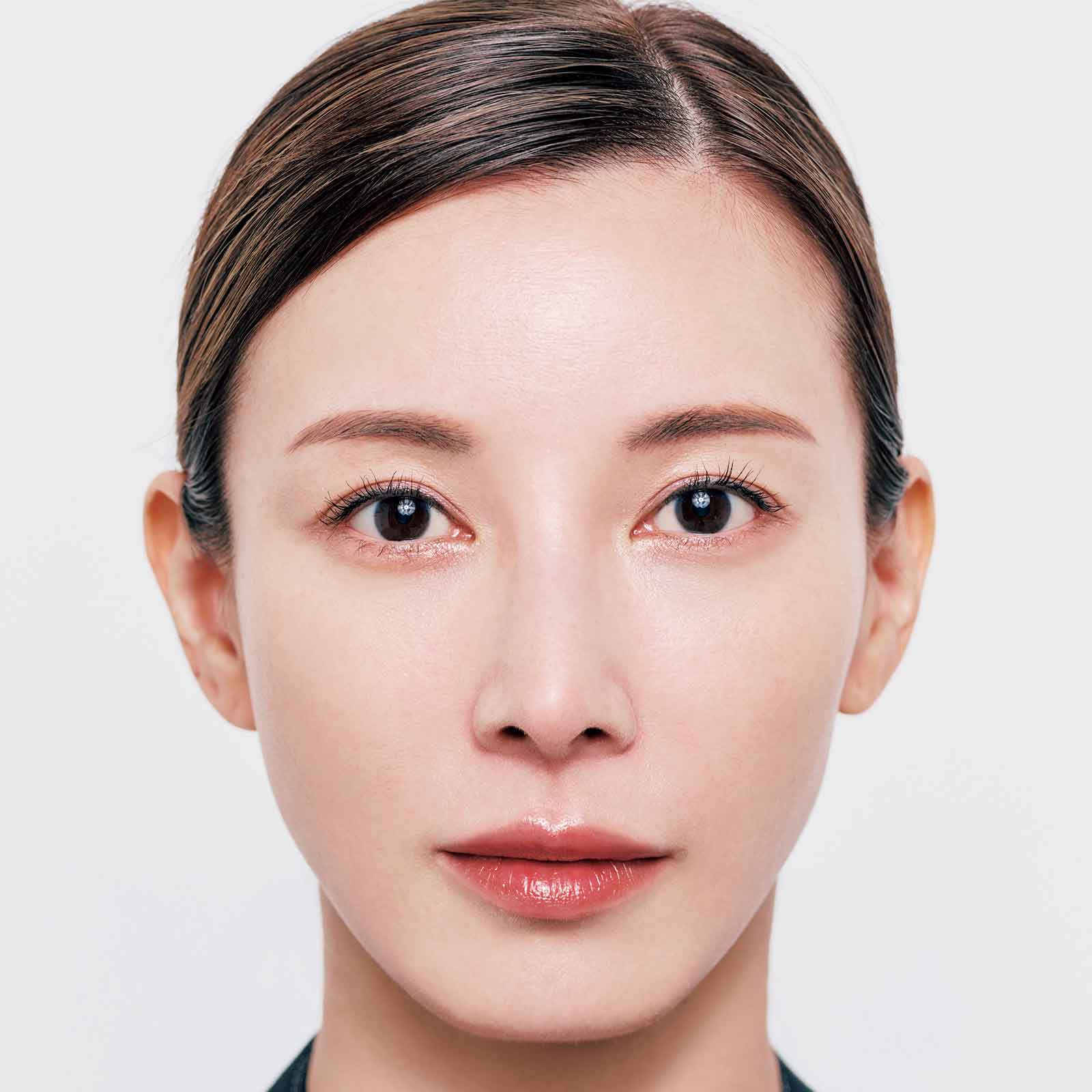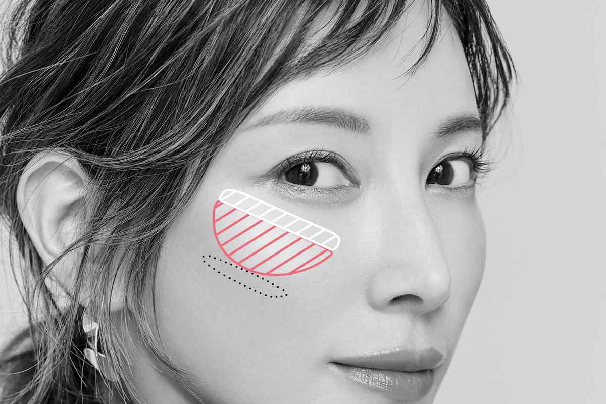 上辺がまっすぐ、下辺がラウンドになった逆かまぼこ形にチークを入れ、上辺・下辺に重なるように直線のハイライトを入れるとリフトアップ&小顔見え。顔の横幅だけでなく、目から下の縦幅も短縮効果が高いんです。