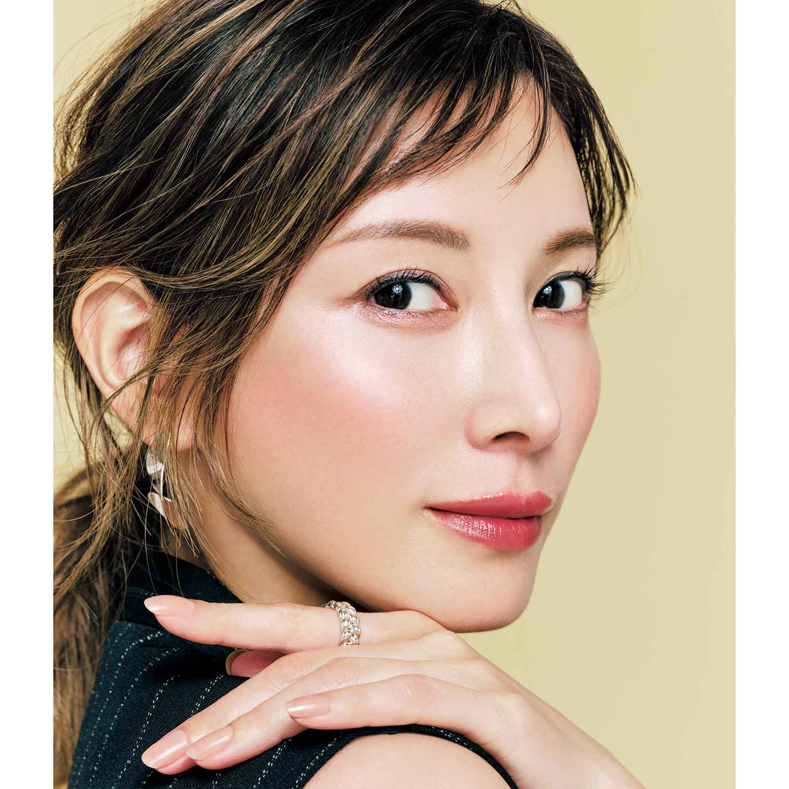 ベスト¥36,300(カデュネ)パンツ¥9,900(Mila Owen/Mila Owen ルミネ新宿2店)ピアス¥5,280〈ieLS〉リング[右手]¥17,200〈vihod〉(ともにロードス)リング[左手]¥15,950(ココシュニック オンキッチュ/ココシュニック)