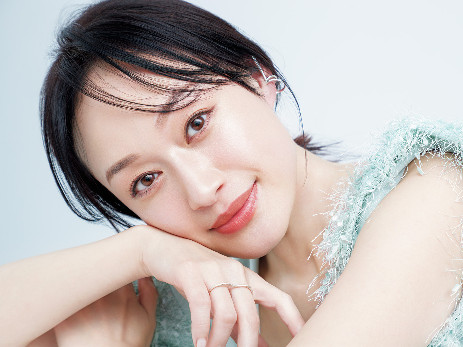 ブラウス¥48,125(ジョセフリブコフ/+9TOKYO) イヤーカフ[左]¥15,400(Jouete)イヤーカフ[右]¥11,000 リング[右]¥22,000 リング[左・人さし指]¥12,100〈すべてfour seven nine〉リング[左・中指]¥16,060〈AYAKA jewelry〉(すべてロードス)