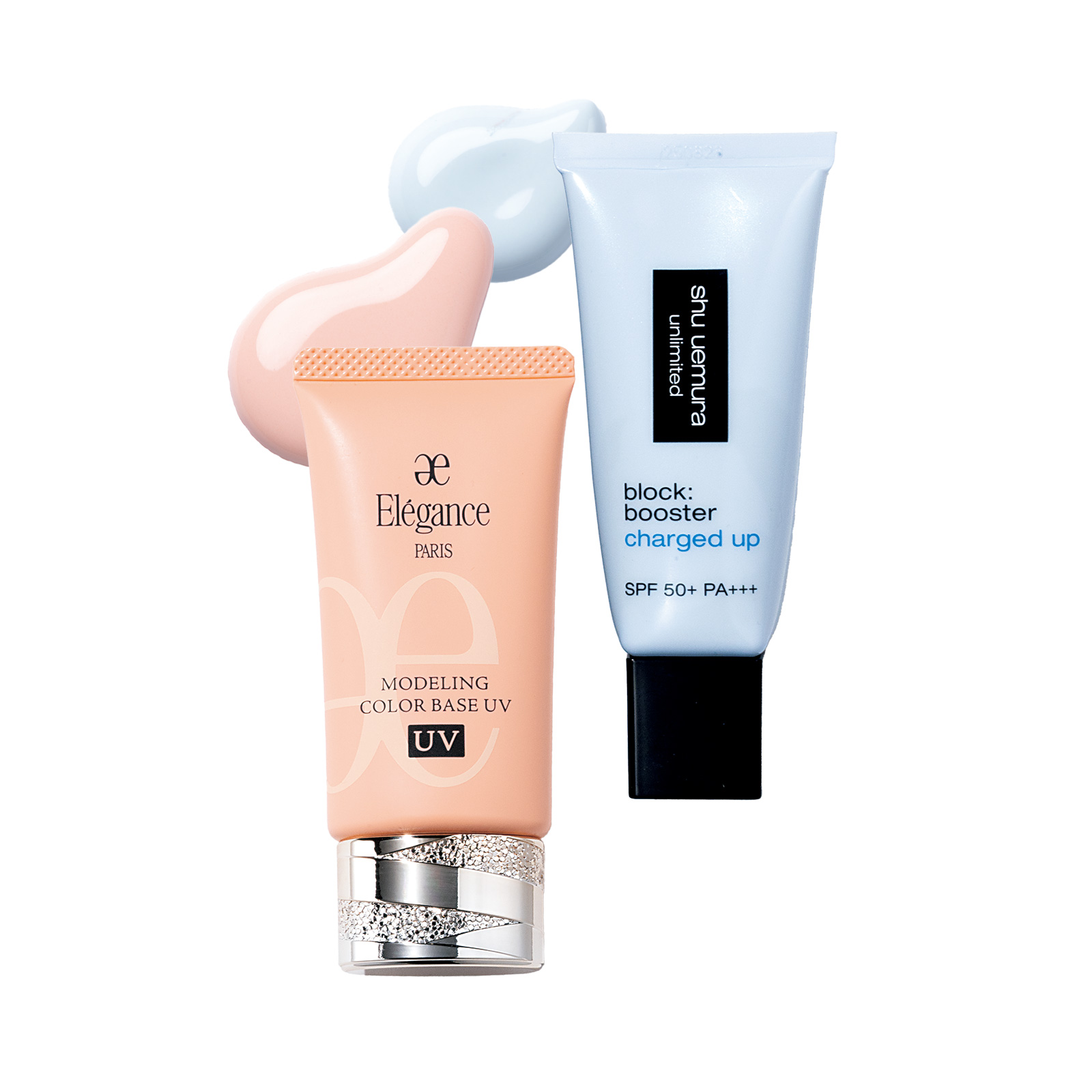 「伸びが良く主張しすぎないカラープライマーで、アラを隠すのがマスト。ブルーは顔色が悪くならず、透明感を引き出して赤みも打ち消すシュウをセレクト。オレンジは透け感とカバー力のバランスが優れたエレガンスを。白浮きせずに沈んだ肌色を補整してくれます」(AYAさん)。左:温もりのあるヘルシーな印象へ。モデリング カラーベース UV OR220 30g ¥5,500(エレガンス コスメティックス) 右:独自のブルーパールが◎。アンリミテッド ブロック:ブースター アドバンスト ルミ ブルー 30ml ¥5,830※3/4発売(シュウ ウエムラ)
