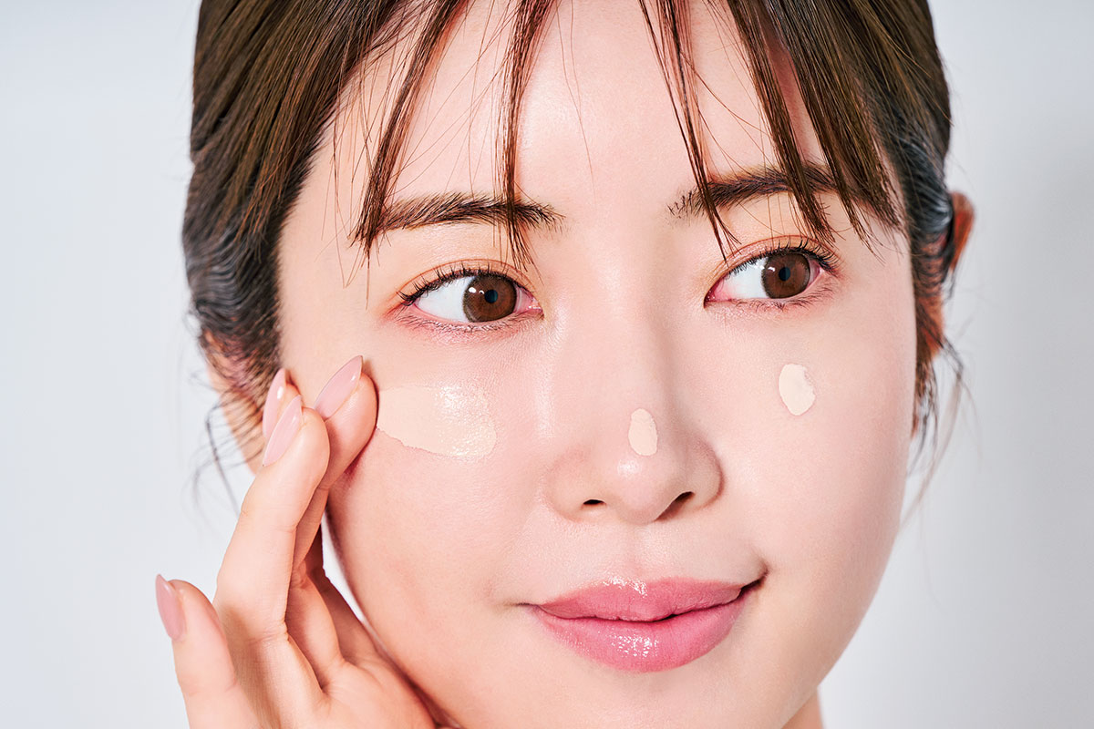 優秀な最新下地に注目!重ねるとヨレるイメージは完全に払拭。むしろ重ねることでファンデーションが肌にピタッと密着し乾燥まで防ぎます。くずれやすい顔の中心から指で塗布して。