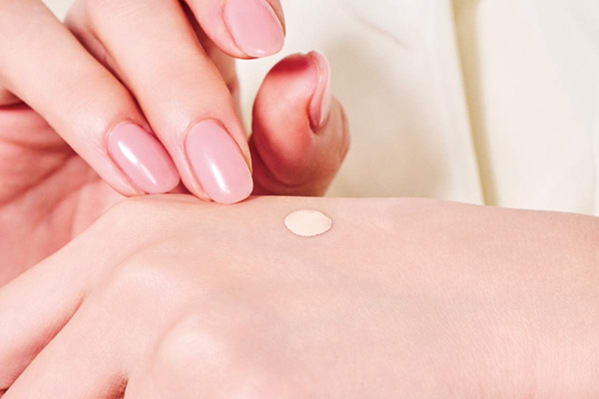 リキッドファンデは量が大事!大人の肌こそ半プッシュで十分です。手の甲にとり、顔の中心部に3点置き。放射状に伸ばしつつ塗布して顔周りは手の残りを塗るくらいでOK。