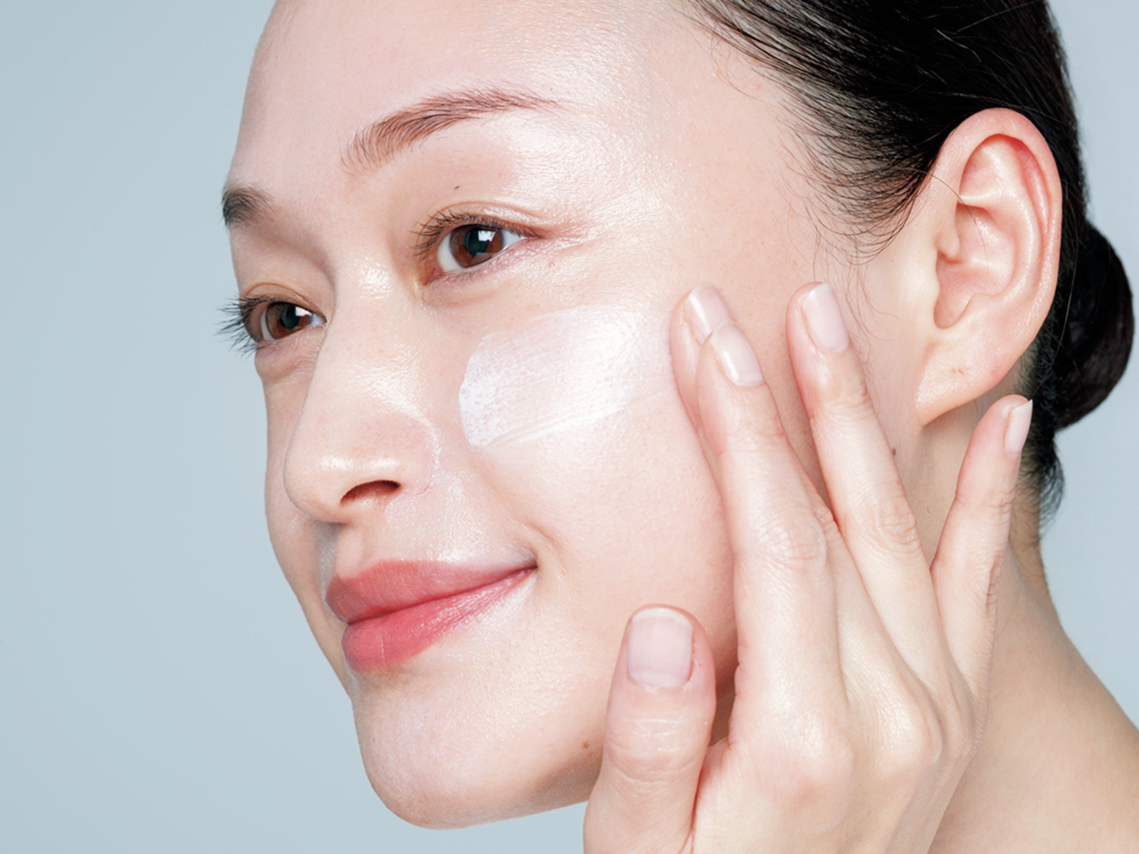 【1】カラー下地は米粒大でOK。ブルーの下地は、小鼻の周りやアゴ先など赤みが目立つ部分にピンポイントで馴染ませます。赤みが強い人は、グリーンを選んで。