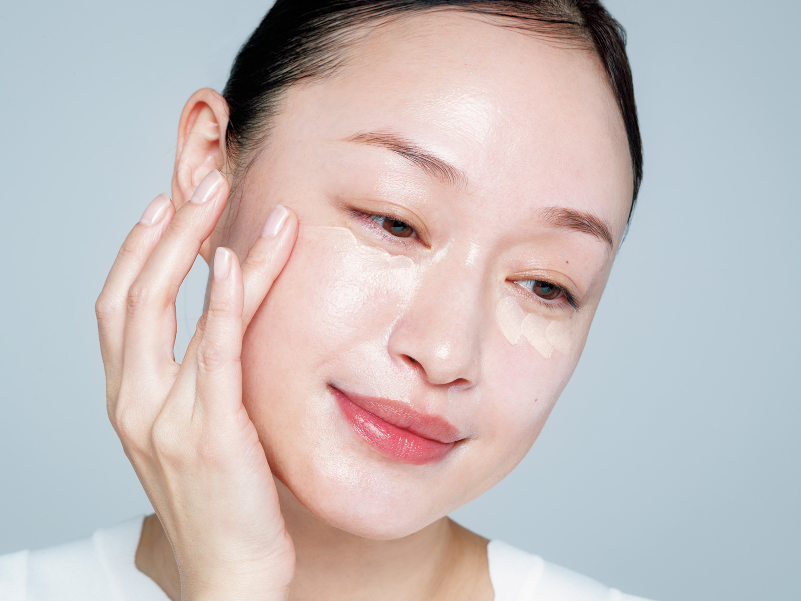 【2】ブルーやグリーンの下地は、透明感を引き出してくれるため、黄ぐすみを払拭するのにも最適。この場合は、くすみの気になる部分に広く薄く馴染ませていきます。