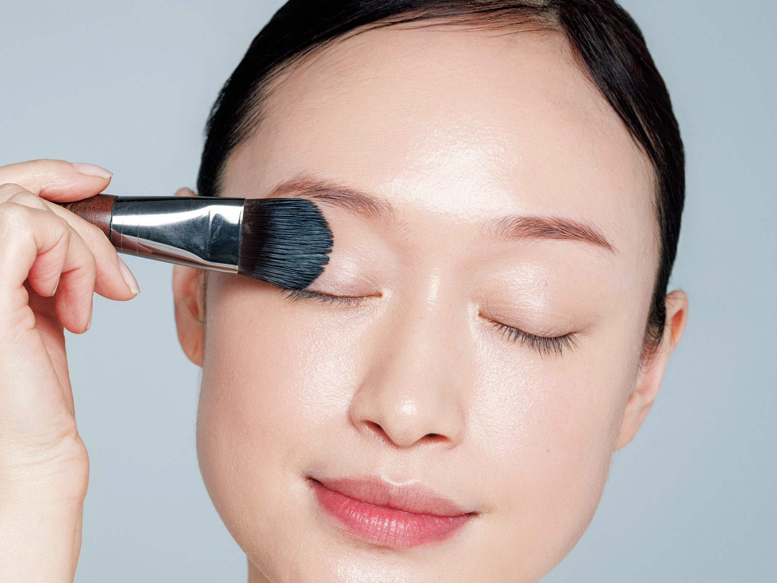 【3】ファンデーションが、二重などまぶたの溝にたまらないように、軽くブラシをスワイプ。薄く薄く伸ばすのがコツ。
