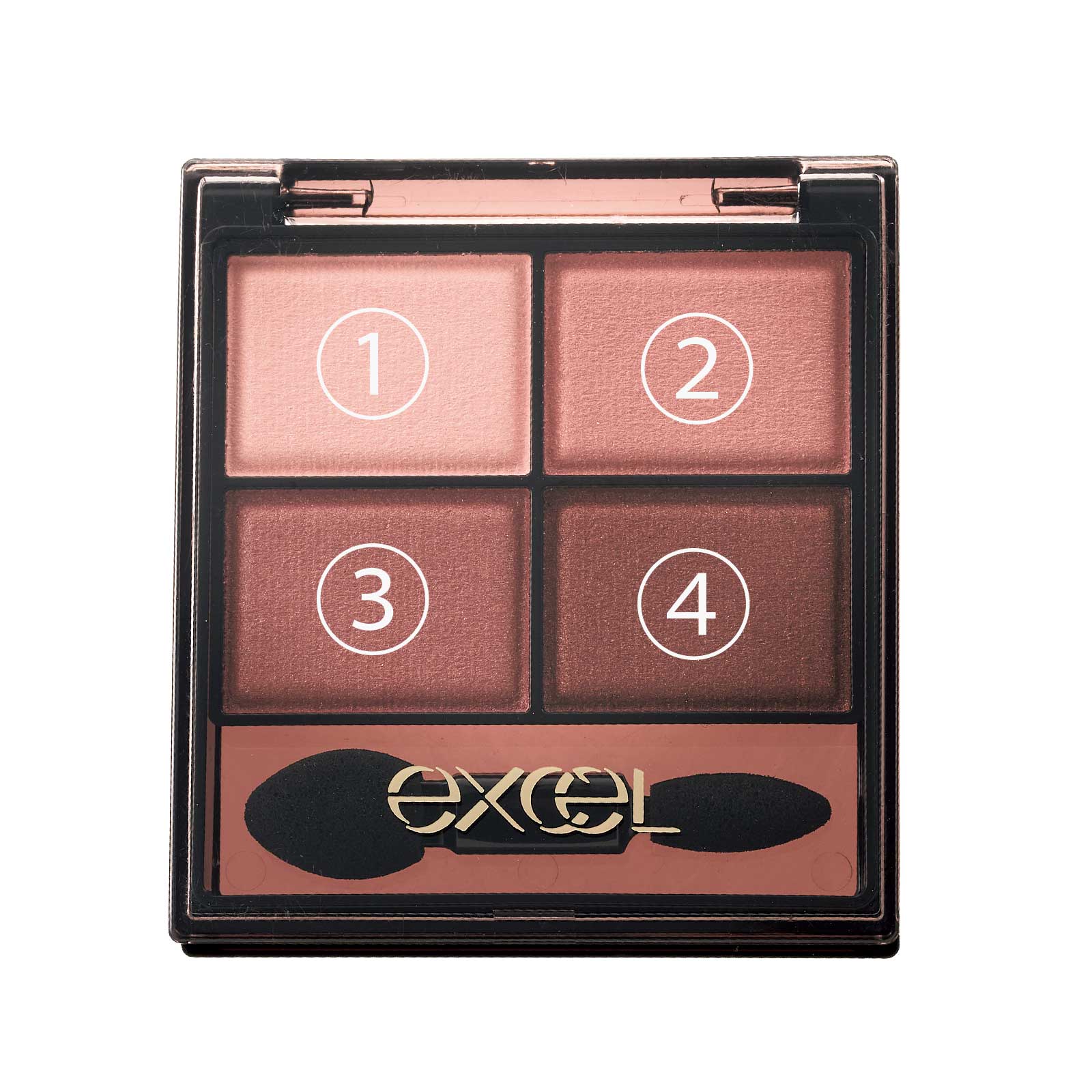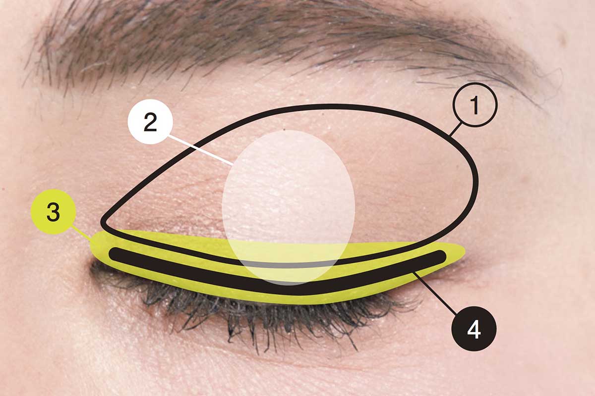 ①のカラーをアイホール全体にのせ奥行きのベースを。②のニュアンスベージュをまぶたの真ん中に。③のアクセントカラーで二重幅に影を作る。④を細くアイライン上に埋めるように引いて。