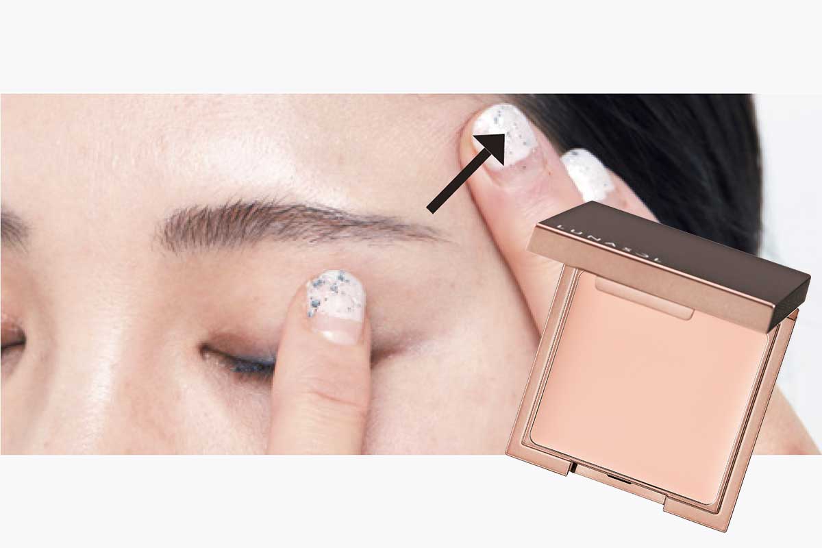 アイシャドウの繊細な発色を引き出すのがたるみまぶたを攻略する鍵。だからアイシャドウベースはマスト。斜め上にまぶたを引き上げながらルナソルのシャドウベースをオン。