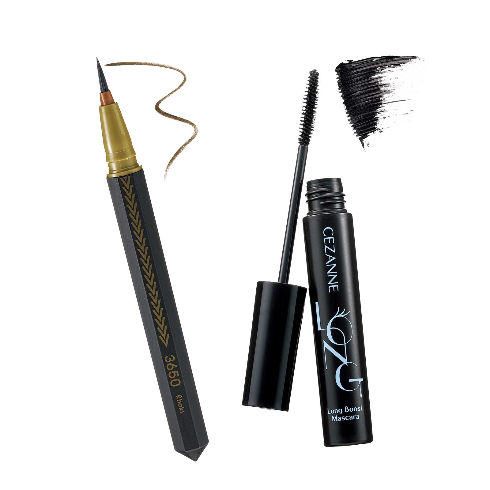 左 ほどよい透明感がある洒落感カーキでやりすぎない目元強調メークをアシスト。3650 リキッドアイライナー カーキ¥1,650(D-Neeコスメティック) 右 ロングブースト液で美しく長いまつ毛に。まぶたににじみにくいマルチプルーフ設計。セザンヌ ロングブーストマスカラ01¥693(セザンヌ化粧品)