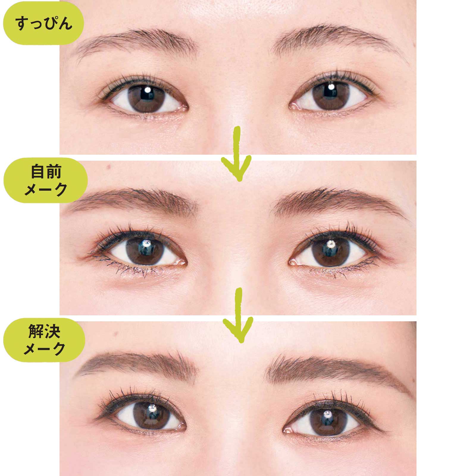 たるみ悩み解消メイクは、のっぺり広くなったまぶたの面積をきゅっとコンパクトに見せるためナチュラルに立体感をプラスすること。さらに横ではなく眉やまつ毛などで縦のラインを強調するのがポイントです。