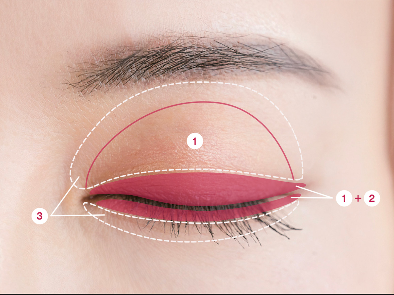 ①をアイホールに、①と②を混ぜてキワから二重幅まで塗り、筆の残りを下のまつ毛キワ全体にうっすらのせる。③をアイホールの上半分と下まぶたに広めに入れる。手持ちのアイラインでまつ毛の間を埋めて、目尻のラインは②を取った細いチップで横にぼかし、影で目幅を拡大。