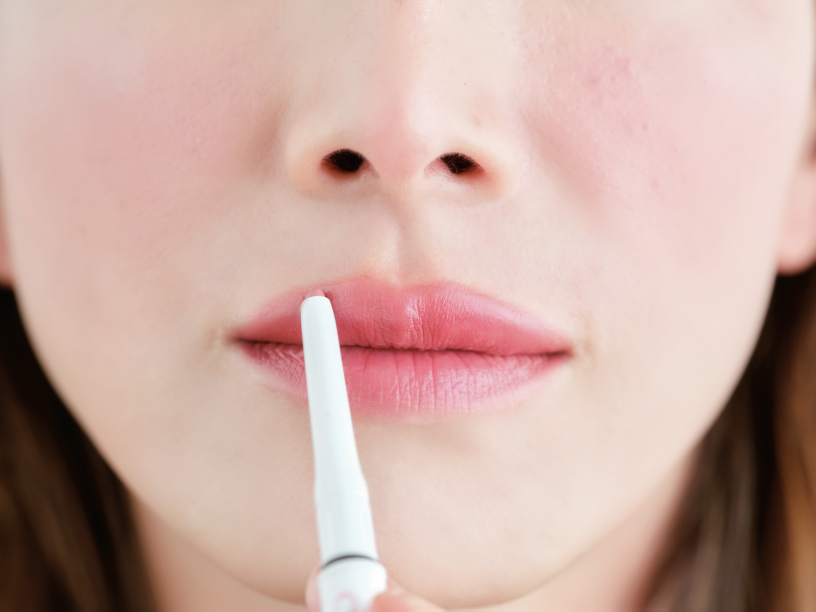 リップライナーで上も下も塗りつぶす。輪郭はほんのりオーバーめに描き、上から口紅を全体に塗る。ライナーのマット発色を仕込むと色が写真に出やすい。